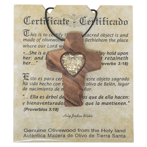 Olive Wood Cross With Heart Necklace