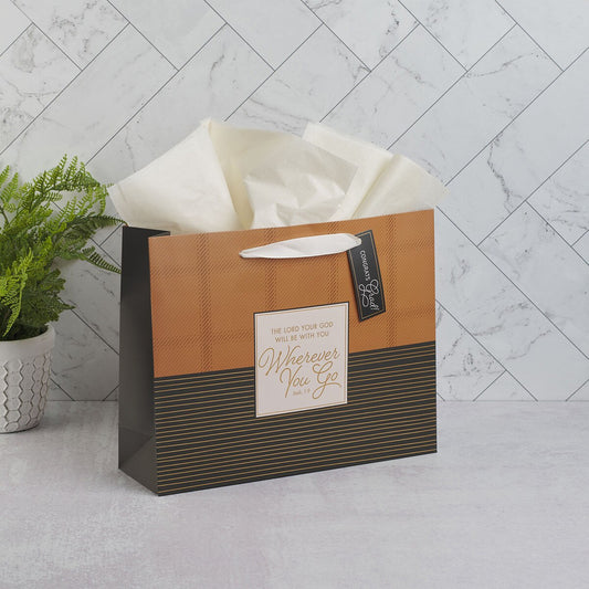 Wherever You Go Brown Striped Plaid Large Landscape Gift Bag - Joshua 1:9