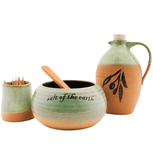 Ceramic Oil Pitcher, Toothpick Holder & Salt Bowl Set
