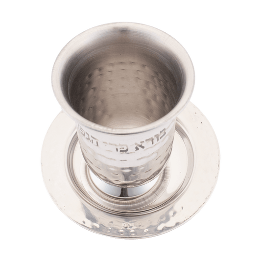 Stainless Steel Hammered Kiddush Cup With Rounded Saucer