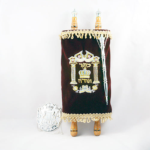 Torah Scroll with a Burgundy Velvet Cover and Accessories (13")