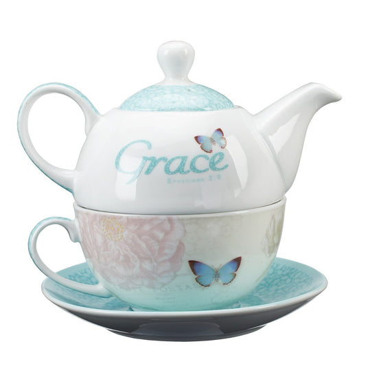 Grace Blue Butterfly Blessings Tea Set for One - Ephesians 2:8