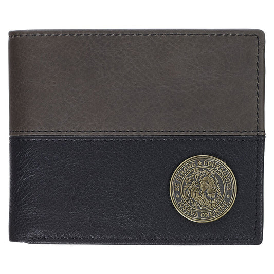 Strong and Courageous Black and Brown Full Grain Leather Wallet with Metal Badge - Joshua 1:9