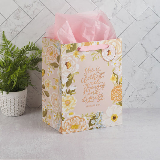 Strength and Dignity Pink Floral Large Portrait Gift Bag - Proverbs 31:25