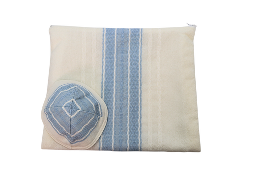 Handwoven Wool Prayer Shawl Set - White and Blue - 40" by Gabrieli