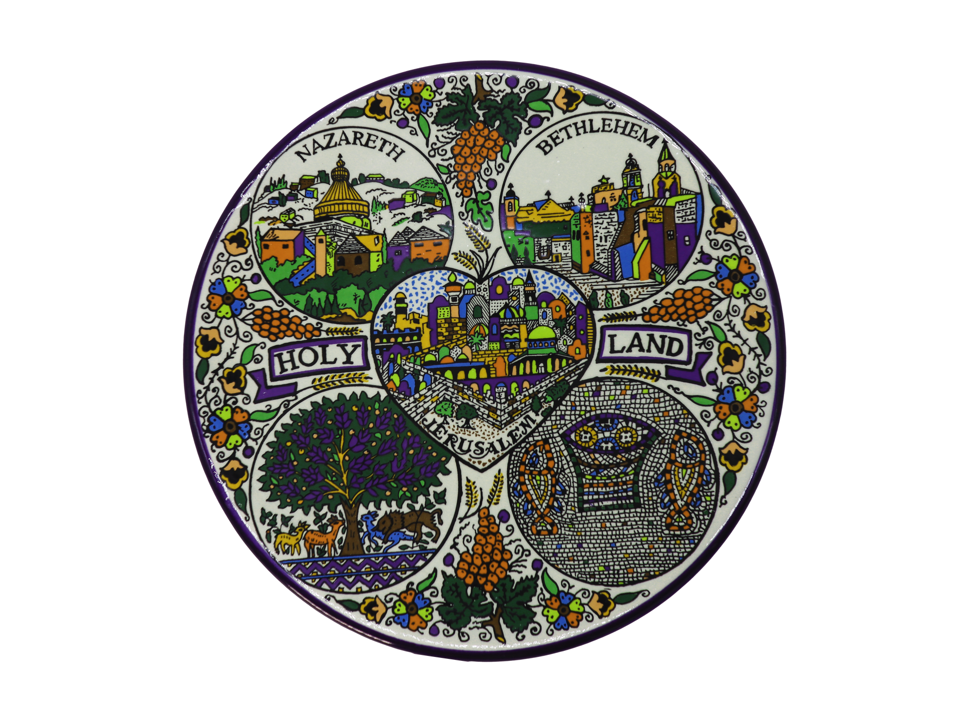 This hand-crafted decorative ceramic Holy Land Plate is comprised of four scenes from around the Holy Land. A great conversational piece. This amazingly colorful plate makes a great housewarming gift.