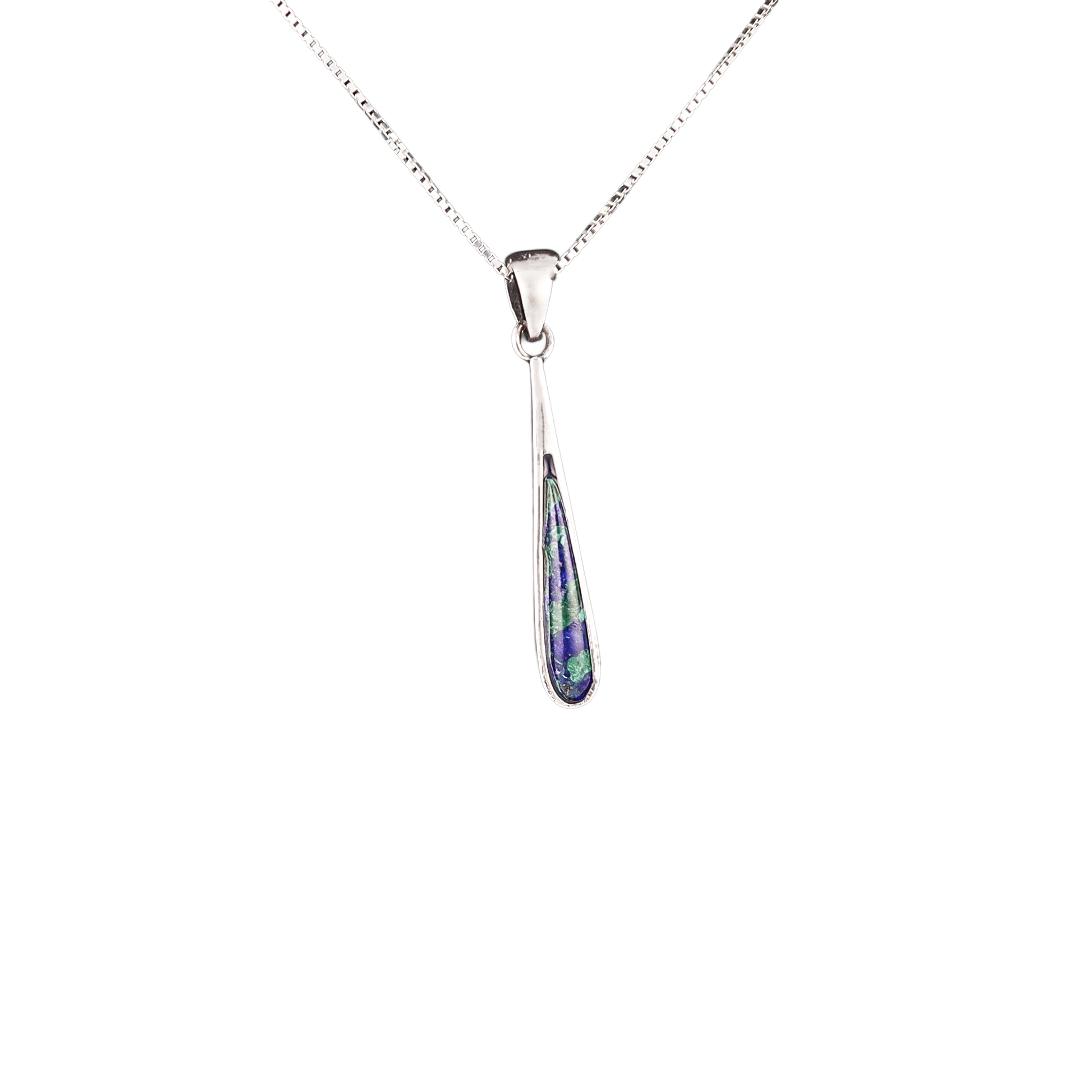 A sleek pendant featuring a thin teardrop-shaped natural Eilat stone set in a polished frame. The rich blue-green tones of the stone give it a refined, elegant look. Simple and timeless, perfect for everyday wear or as a thoughtful gift.