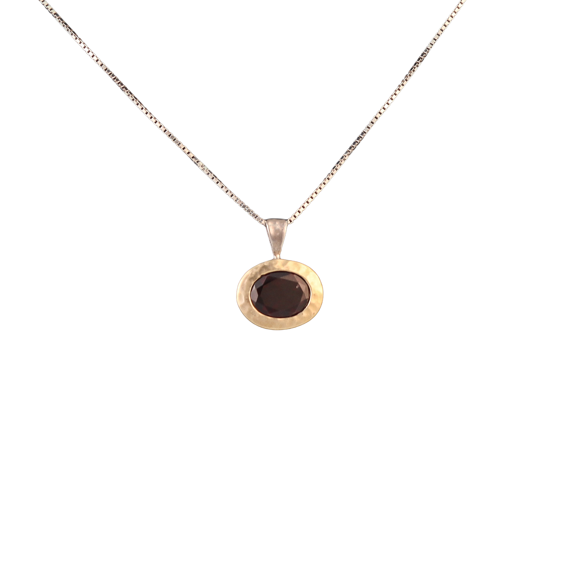 A classic pendant featuring a polished garnet gemstone set in a simple frame. The deep red hue of the garnet adds elegance and warmth to the design. Timeless, versatile, and perfect for everyday wear or as a thoughtful gift.