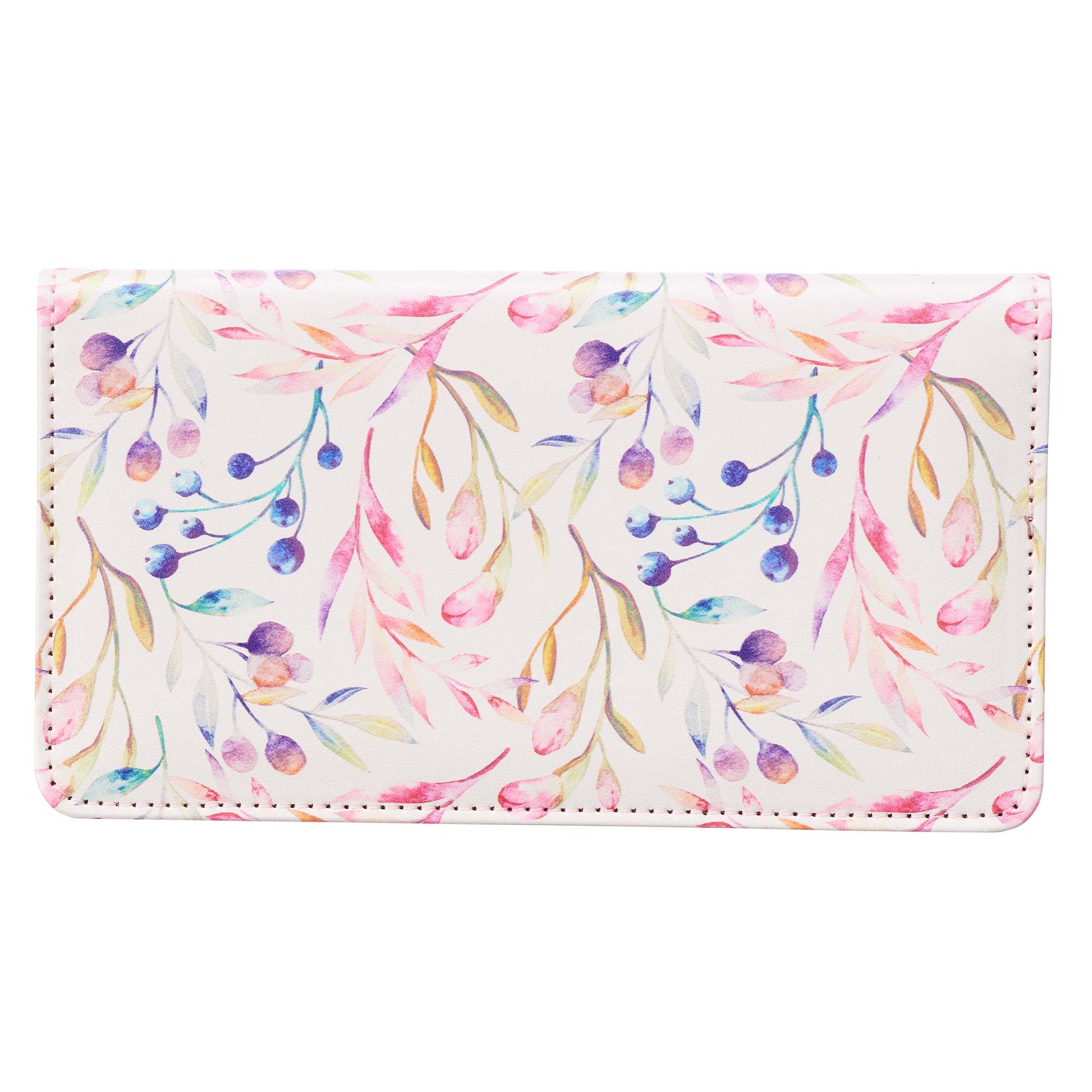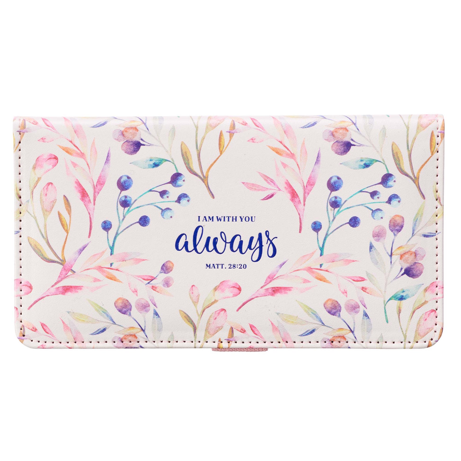 The daintily decorated Faux Leather Checkbook Cover is made of a supple, scuff-resistant white faux leather and adorned with watercolored flower buds, berries, and leaves in soft pastel colors. The pattern starts on the back cover and weaves itself around the spine and around the centered Bible verse written in blue foiled whorled azure calligraphy, with size and emphasis given to the central word of this passage: always.