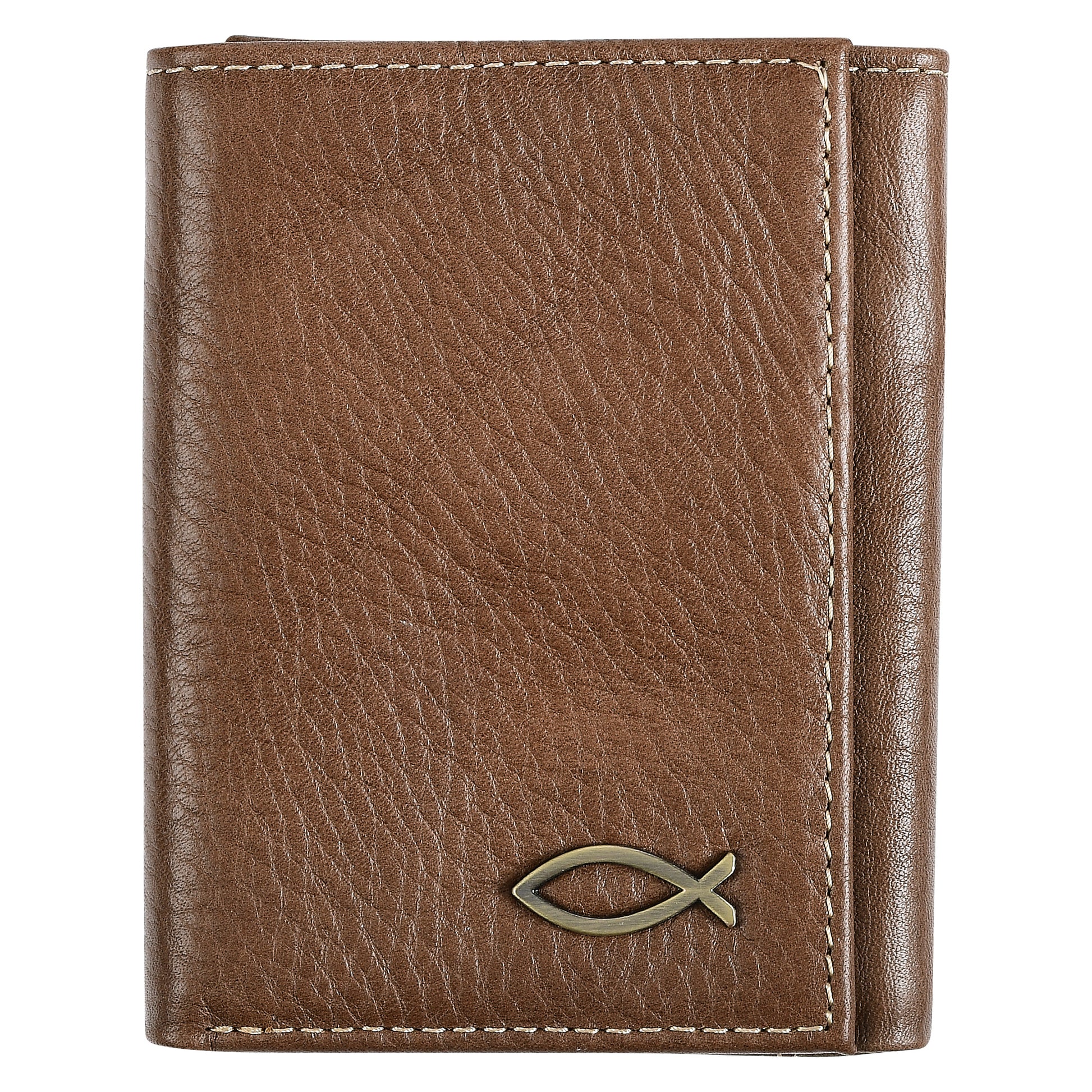 Smooth genuine leather is used in the construction of the brown trifold wallet, and its edges are topstitched to ensure durability. A small brass ichthus fish is the only decoration and is attached to the bottom right corner of the wallet.