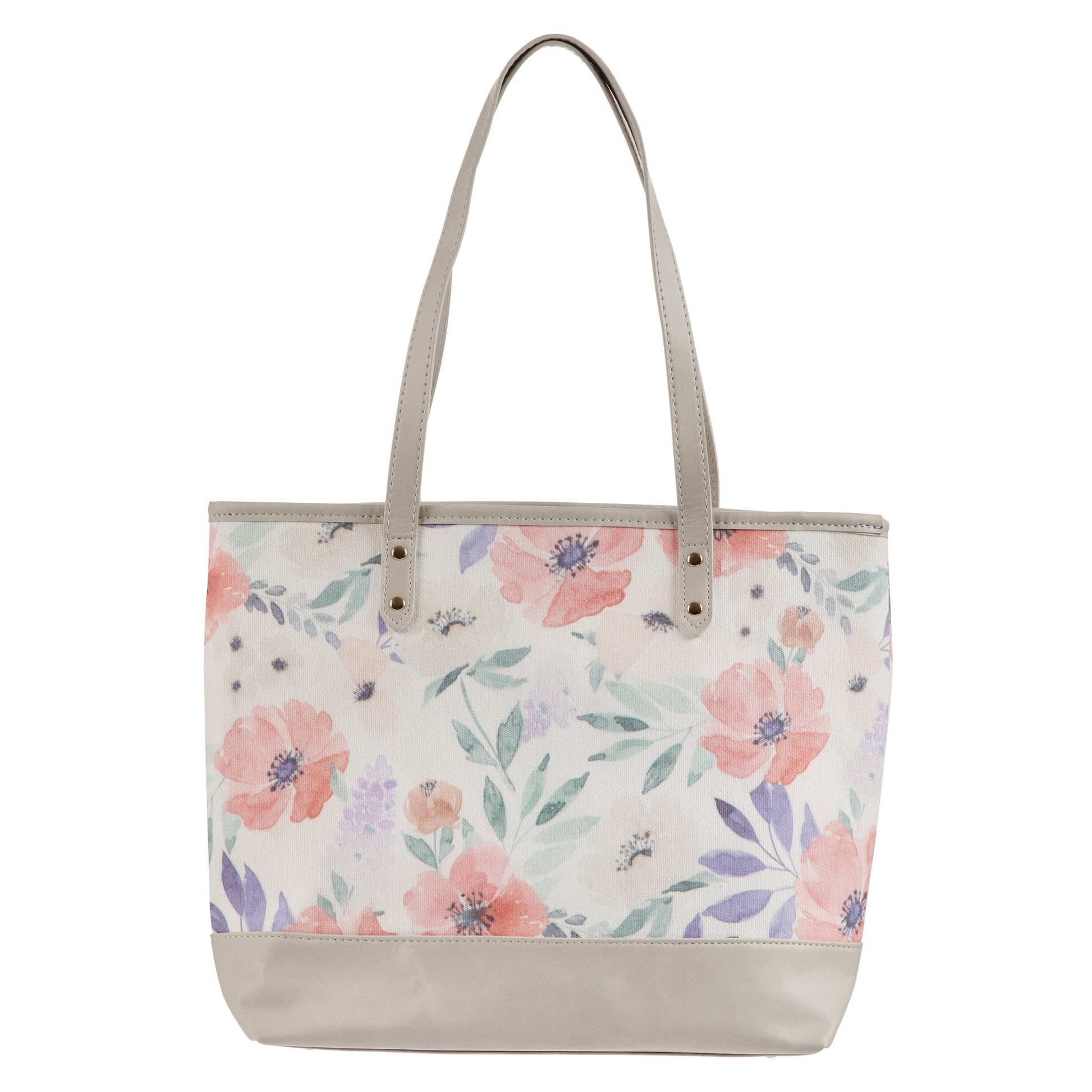 With its bright coral poppies and vibrant purple lilacs, this canvas tote captures the essence of spring and bursts with color. Between the handles, the sentiment is presented on a taupe appliquéd patch.