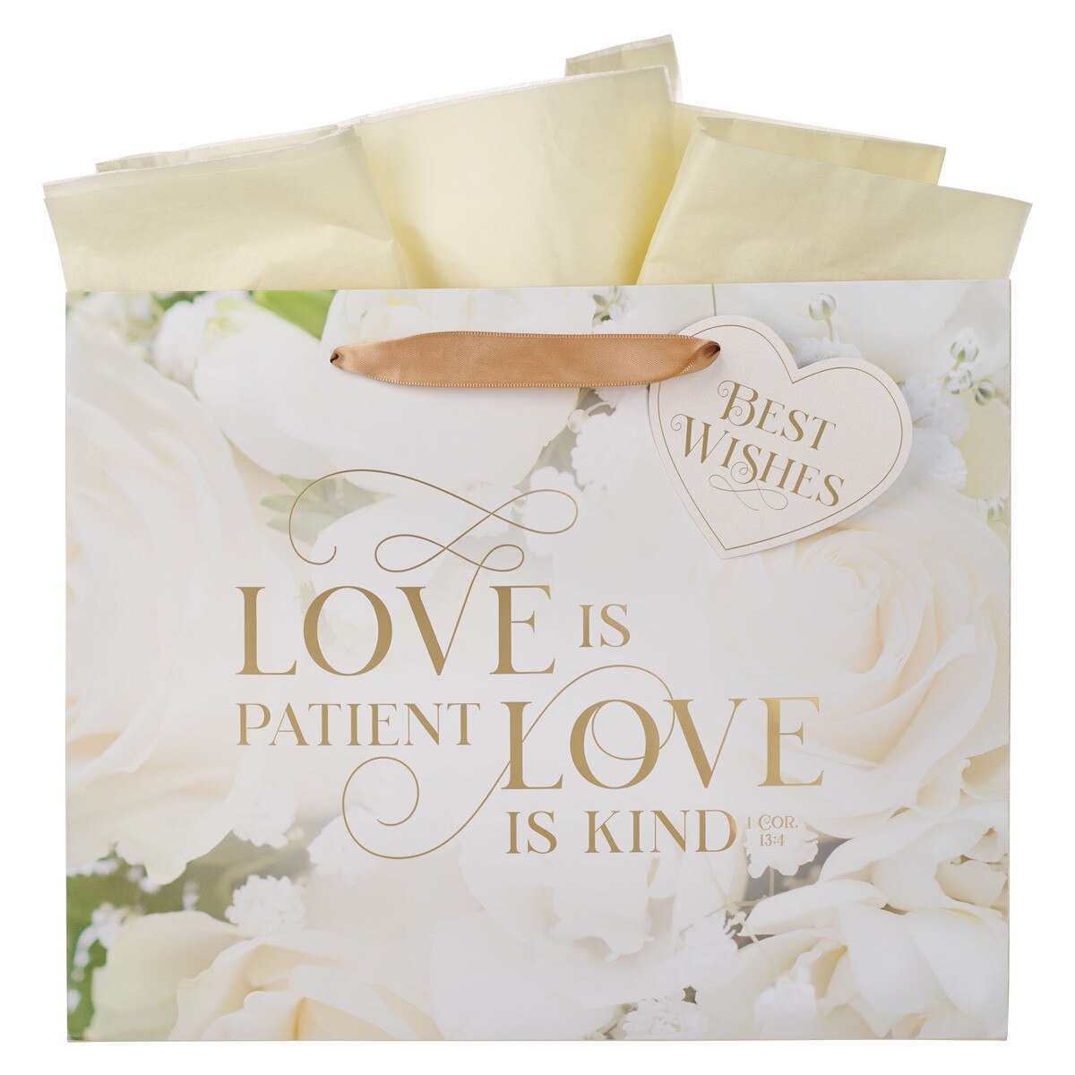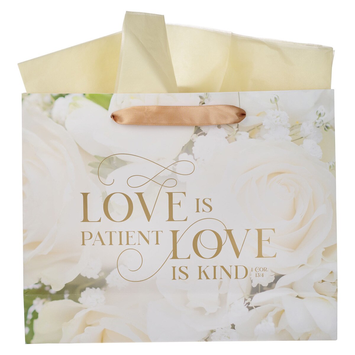 The large gift bag has a romantic white rose design that is paired with delicate baby's breath. At its center, the iconic words from the love chapter in the Bible are displayed in shimmering gold foil lettering.