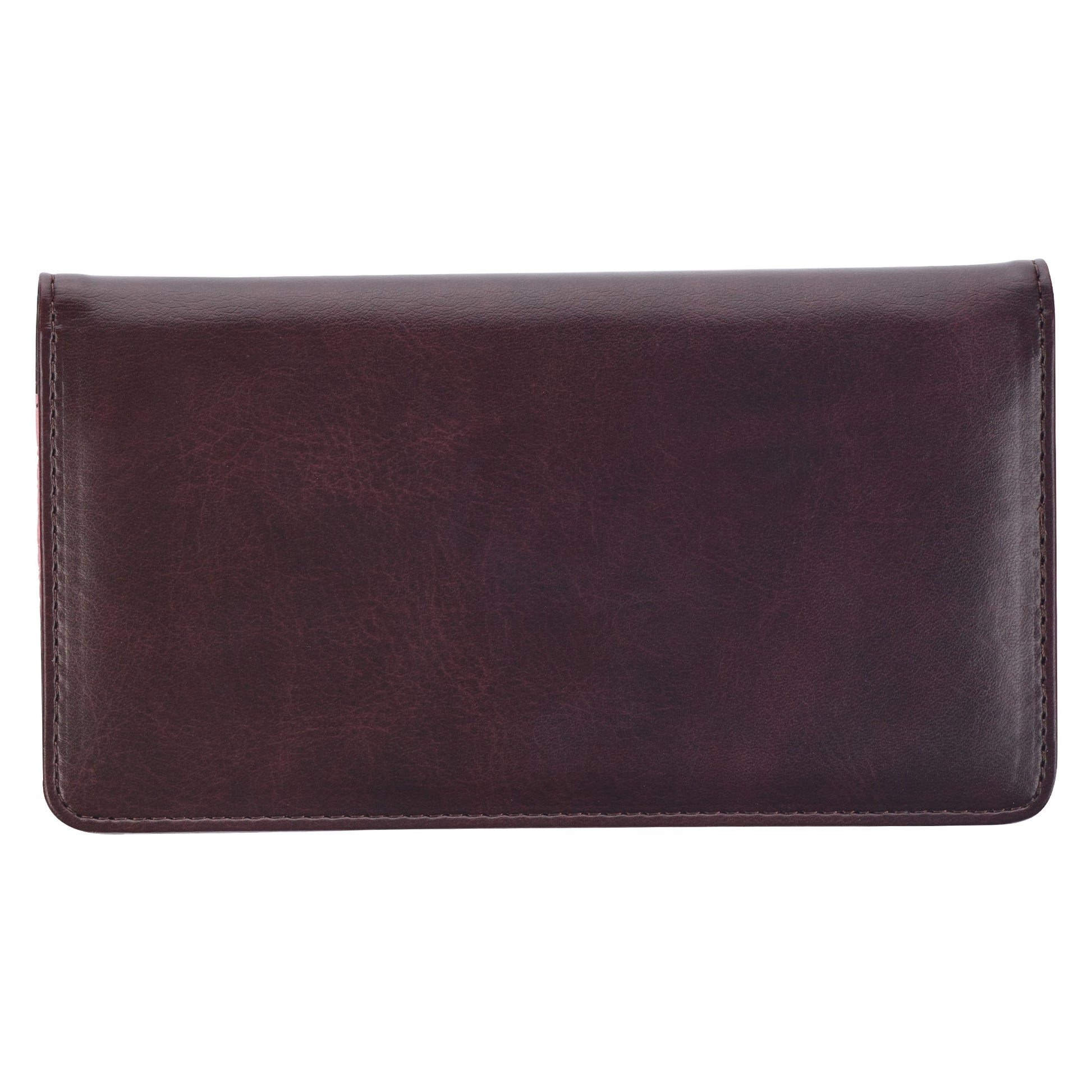 The soft rose pink front panel of this checkbook is covered with heat-debossed and gold foiled rose outlines. A deep burgundy faux leather spine continues onto the back of this checkbook, providing a secure binding. The shining gold foil accented letters of the verse are immediately noticeable and create a beautiful focal point and contrast to their heat-debossed counterparts.