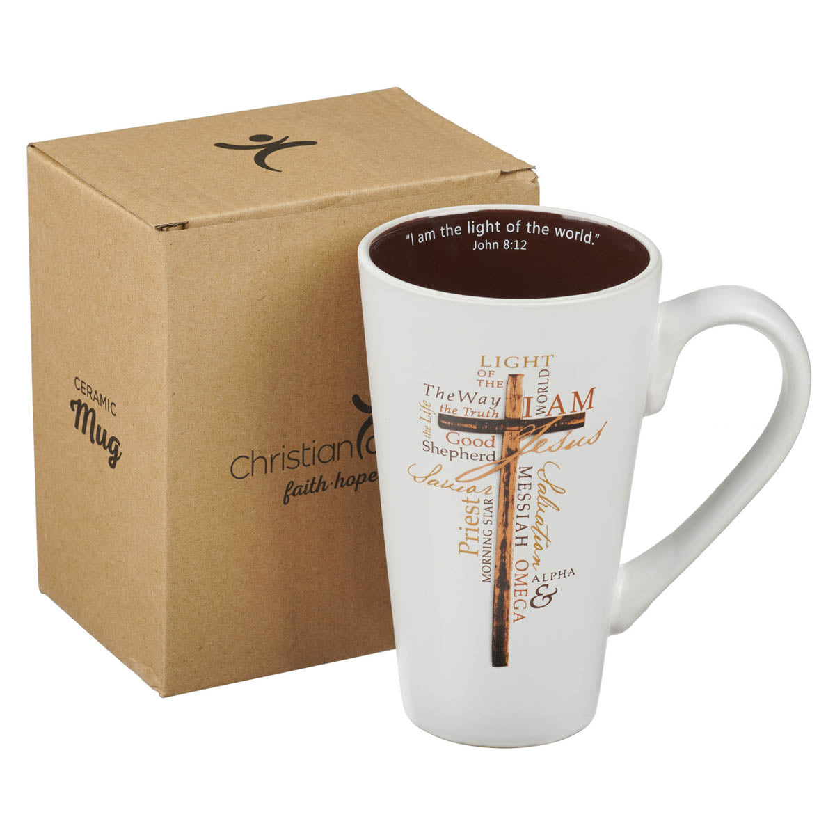 This inspirational mug features John 8:12 and displays a symbolic cross along with the names of Jesus, such as "Savior," "Alpha & Omega," and "Messiah." The traditional design is complemented by its contemporary tall style and is perfect for lattes or hot chocolate.