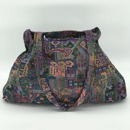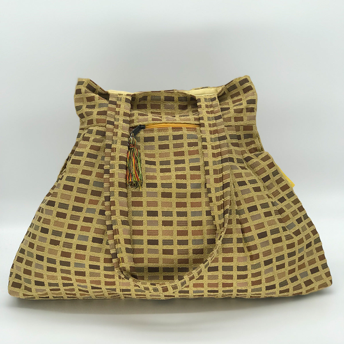 Stand out with our eye-catching Nardin Tote Bag. This handcrafted bag is made from a durable cotton blend that can withstand daily wear and tear. The pleated design and multi-colored contrasting tassels on each zipper make this bag stand out from the crowd. It features a front zipper pocket for easy access to your phone or wallet and a top zipper opening to keep your belongings secure.