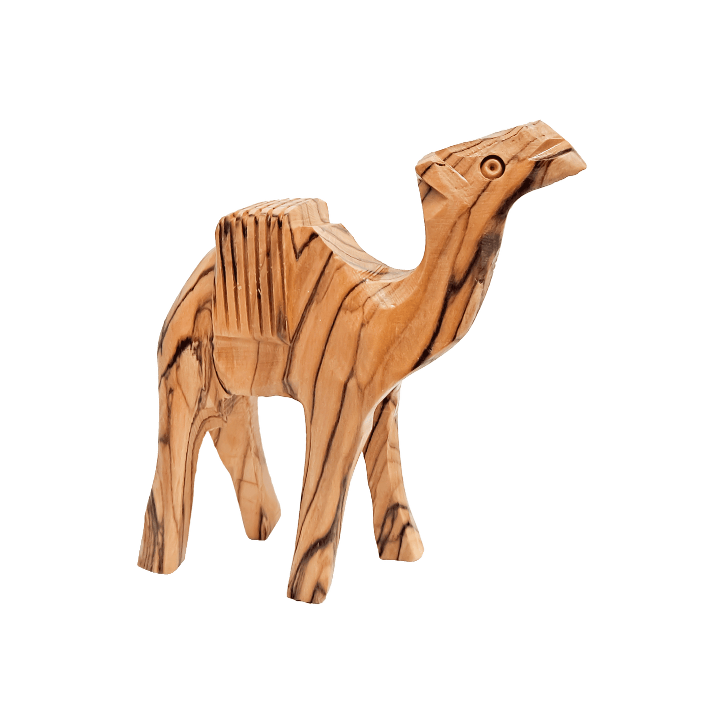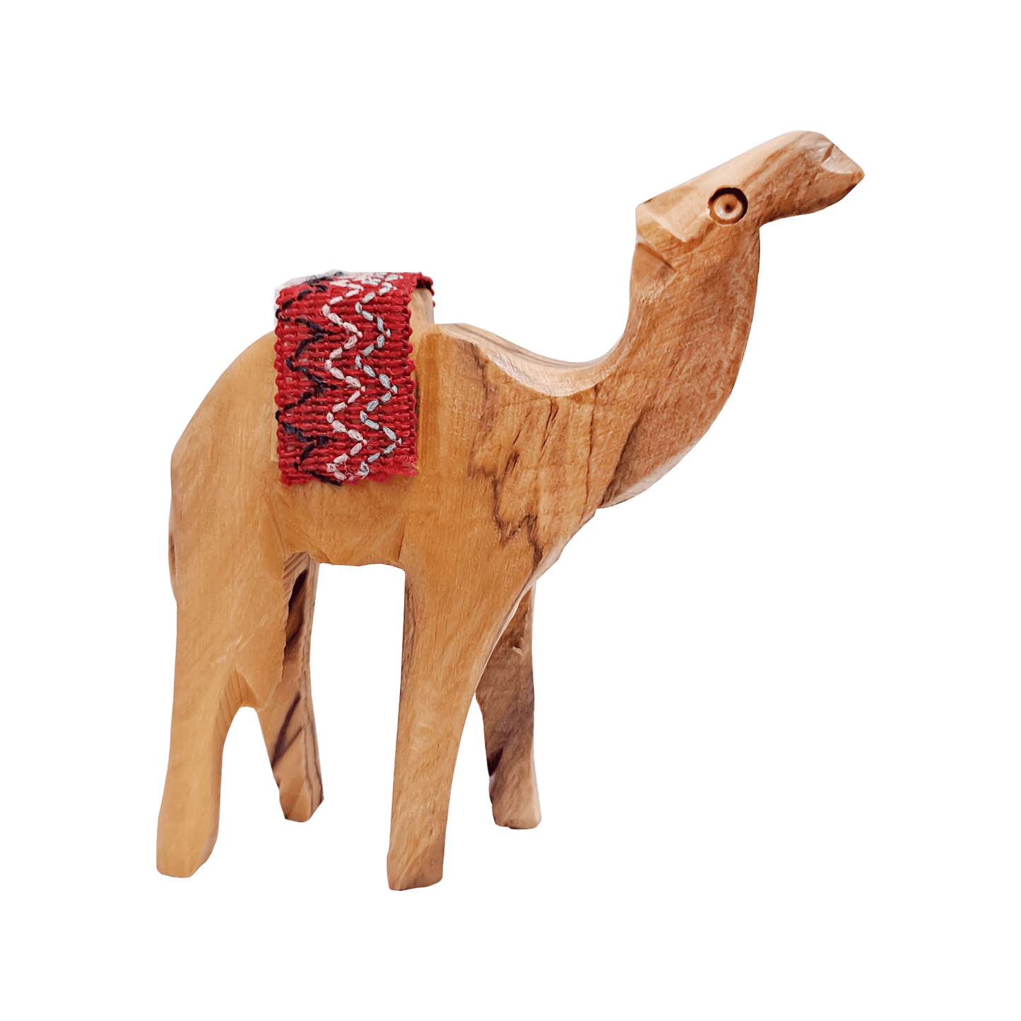 This olive wood camel figurine was hand-carved in Bethlehem. The rich color and interesting grains are characteristic of the beautiful olive wood, making each piece unique. The Bedouin-style saddle makes this piece stand out.