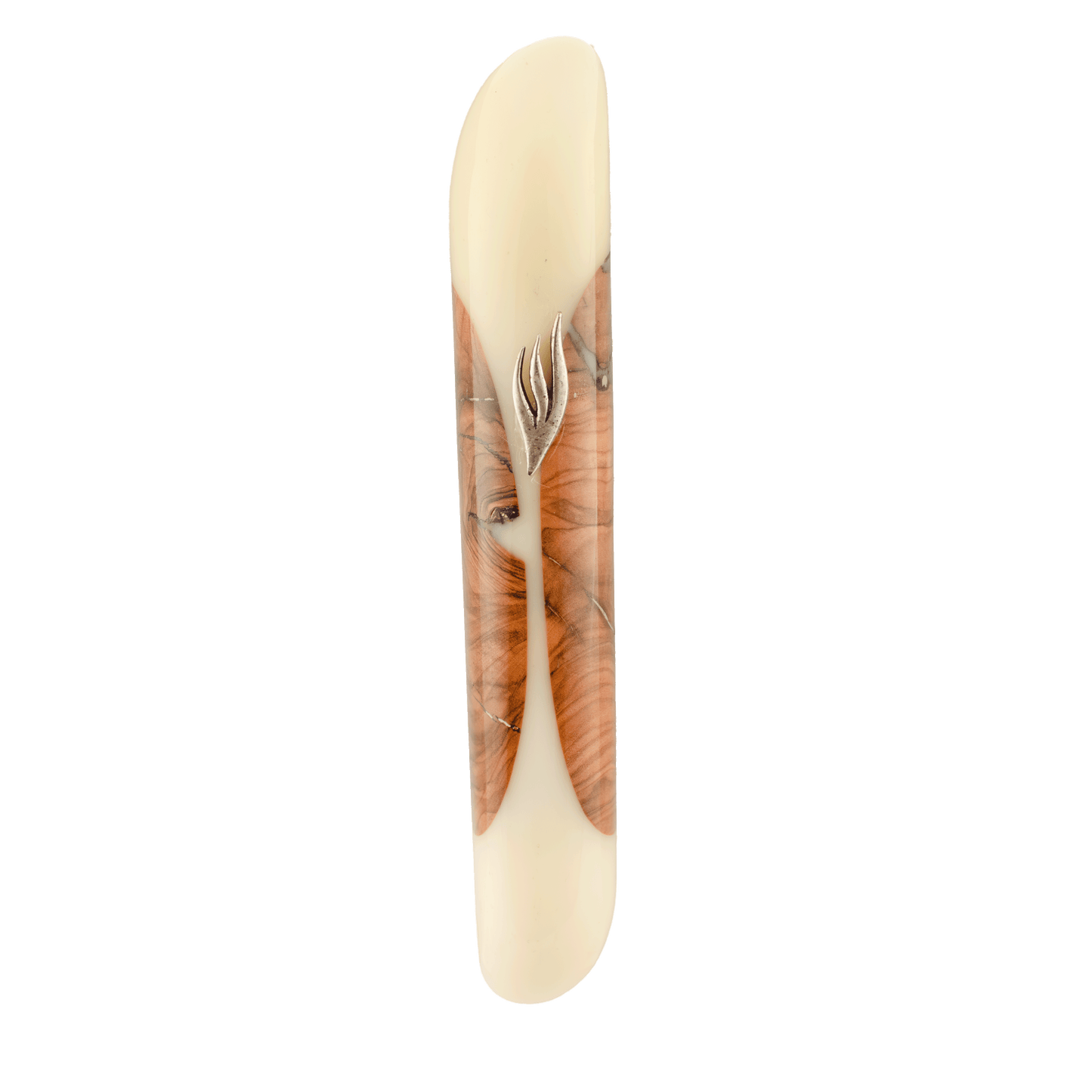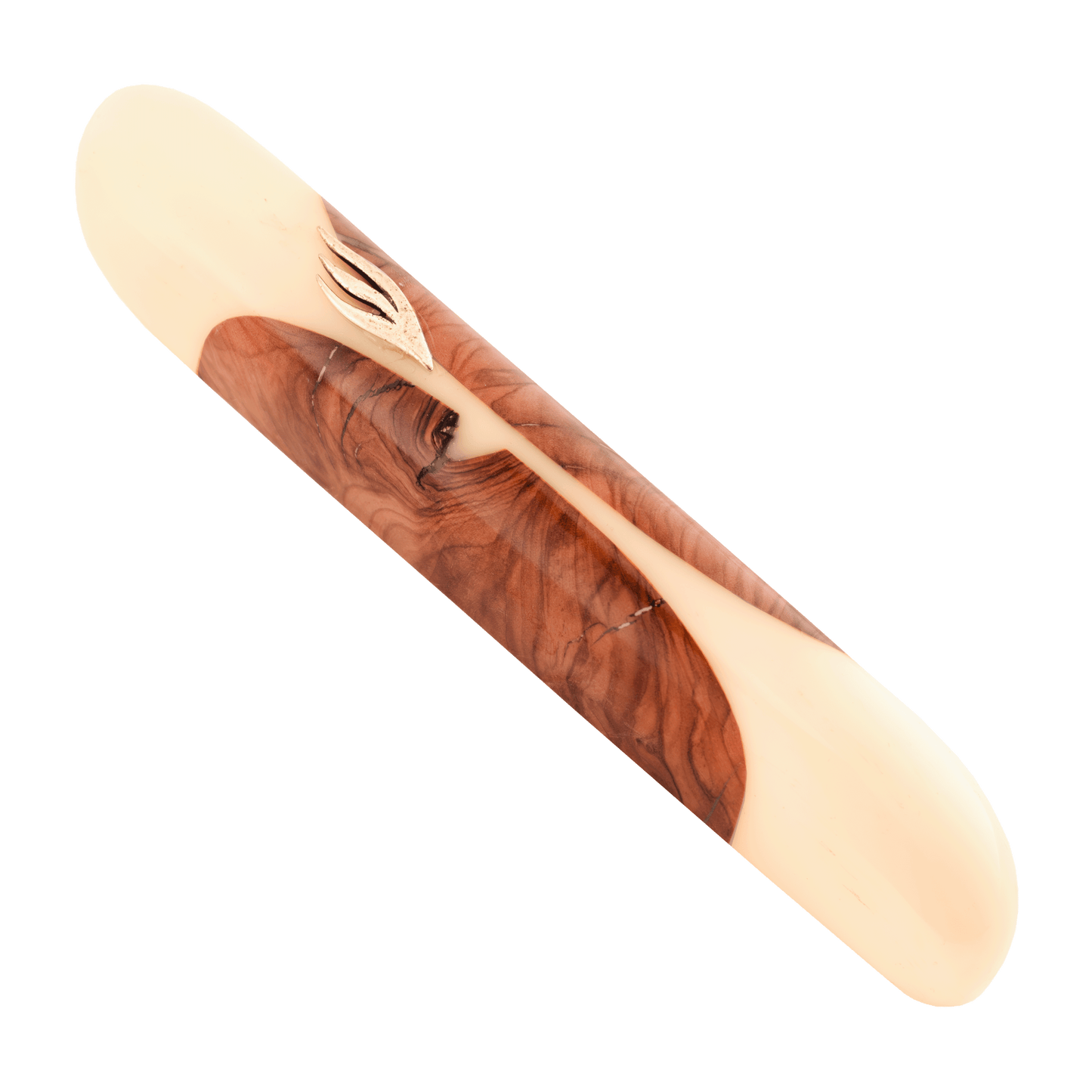 Crafted with meticulous attention to detail, this mezuzah bears the unmistakable touch of Moshe Dayan's artistry. The olive wood, sourced from ancient groves in Israel, lends a warm and rustic charm to the piece, while the resin adds a touch of contemporary sophistication.