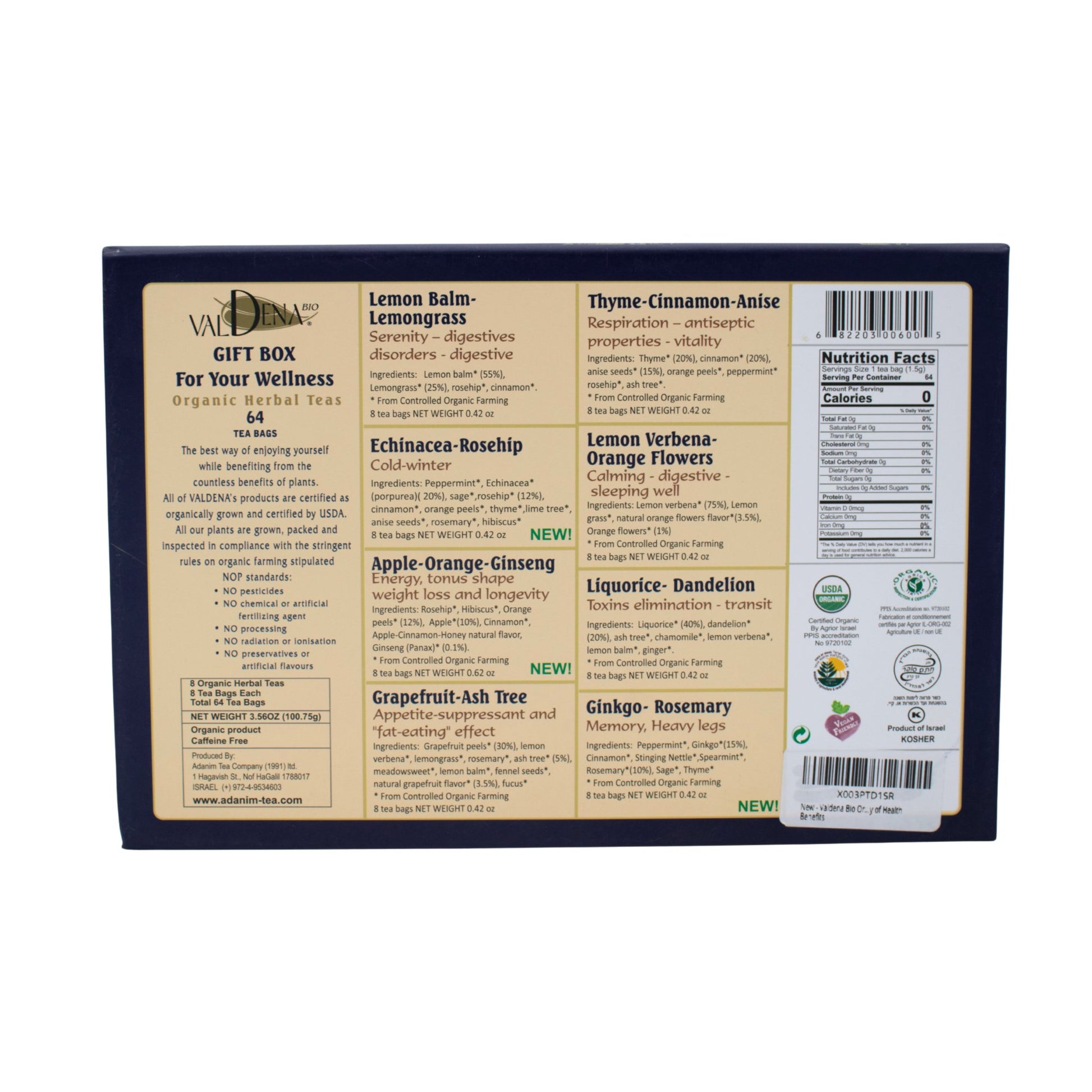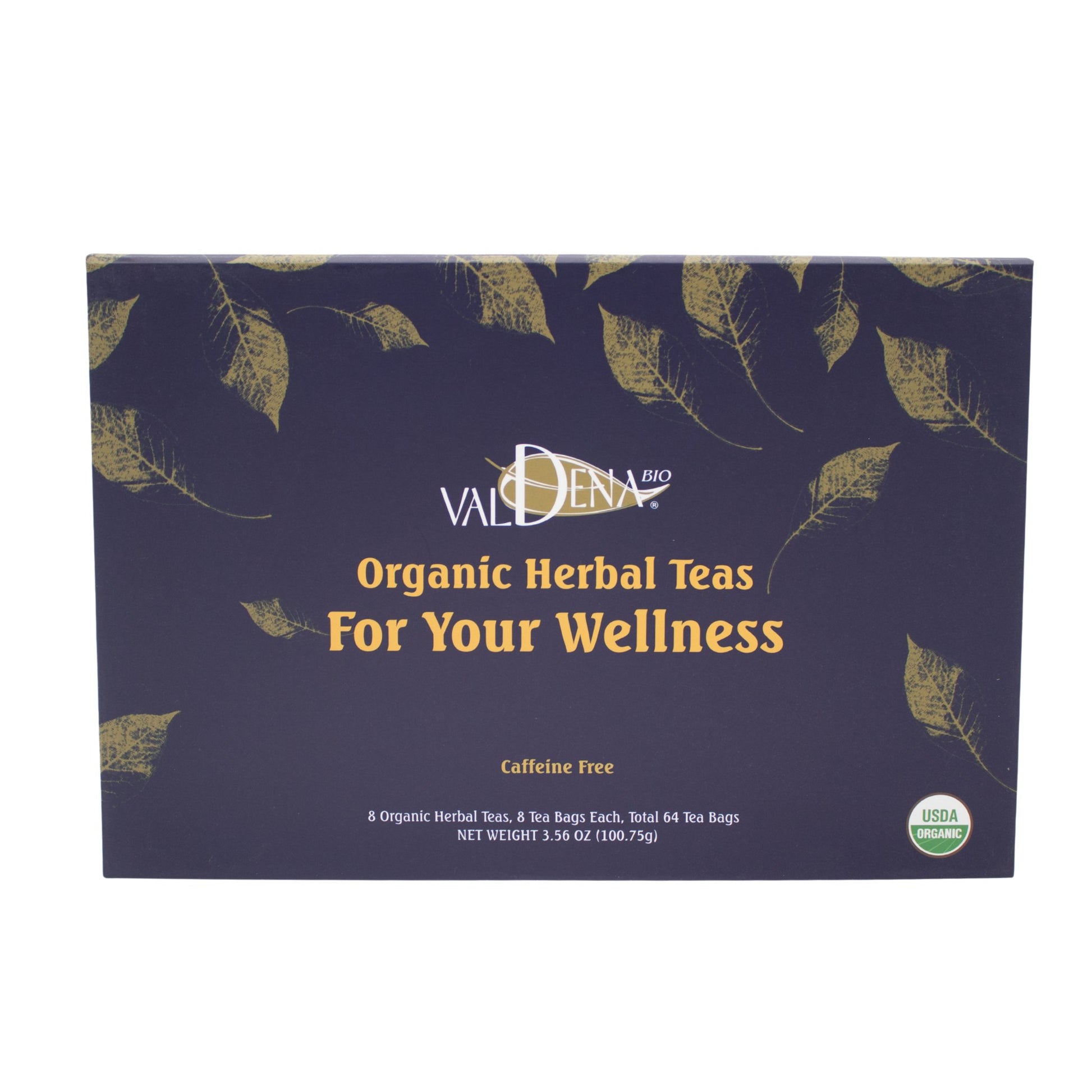 Organic Herbal Tea Valdena Sampler Gift Set Box - 8 assorted tea flavors, 64 total tea bags