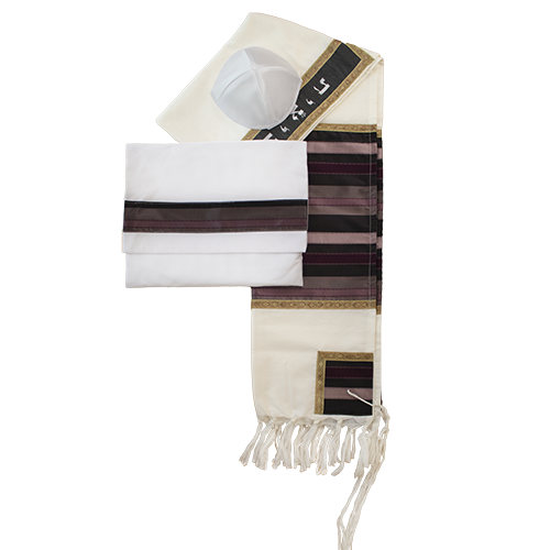 This beautiful lightweight prayer shawl (Tallit) set is from the Gabrieli in Jerusalem. It is made of the highest quality materials. The lightweight cotton prayer shawl is cream-colored and has beautiful hues of rose and black stripes at the ends. This same motif is carried through the neckband and at each corner. The prayer shawl bag is white with the same stripes across the front flap closure. The kippah is white.