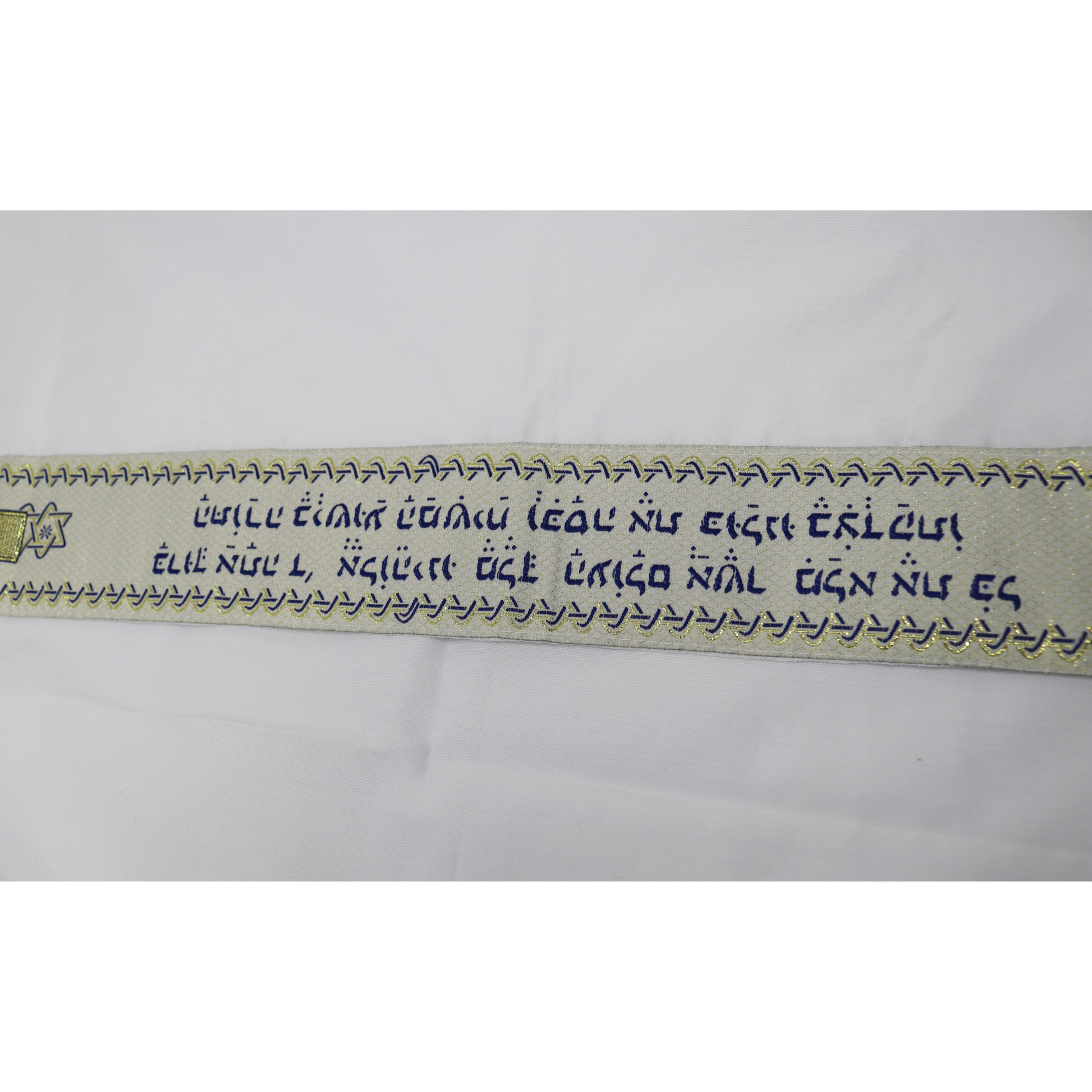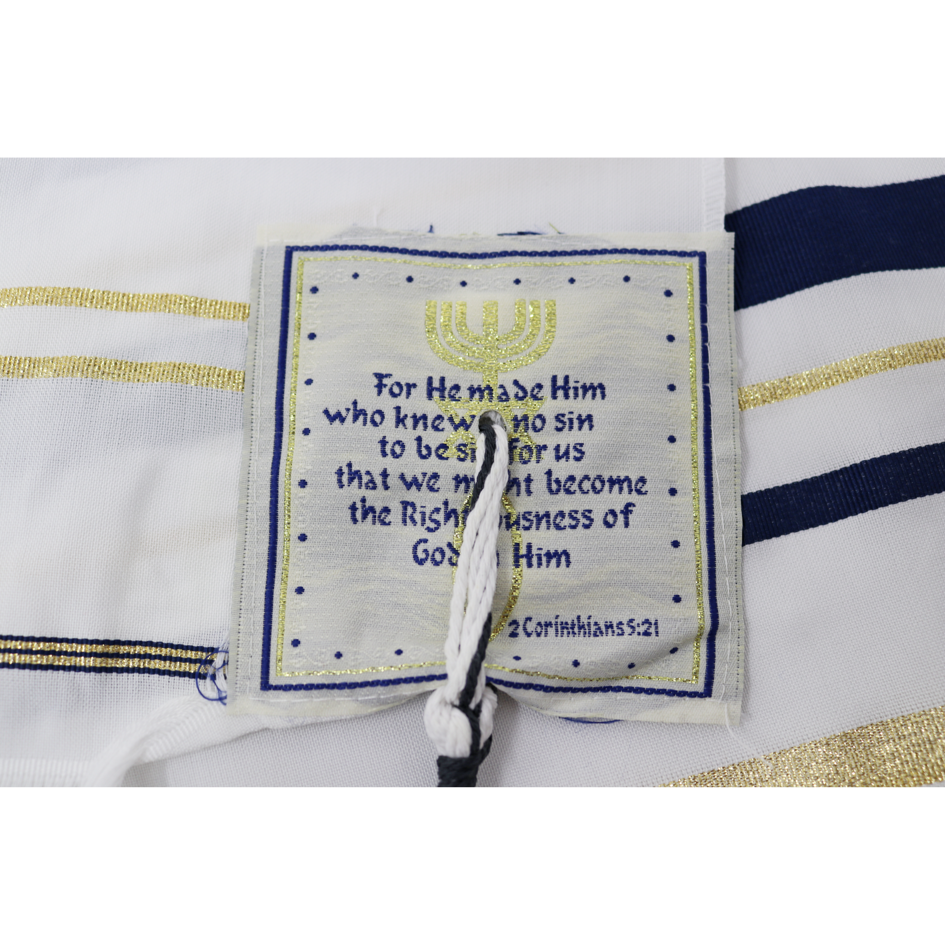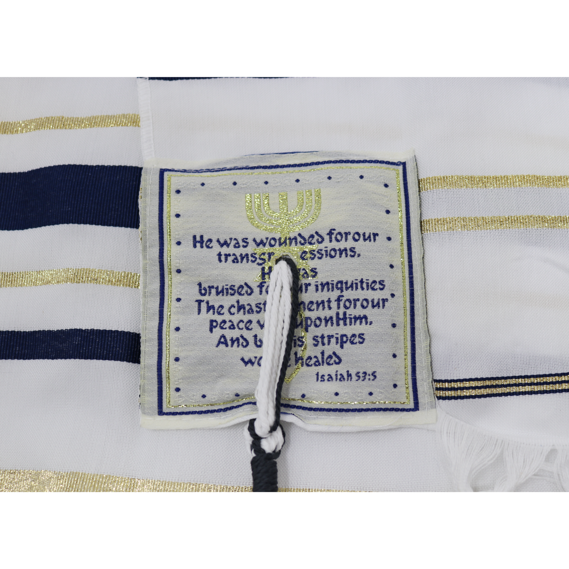White Prayer Shawl with Navy Blue & Gold Accents – A Symbol of Faith, Healing, and Righteousness