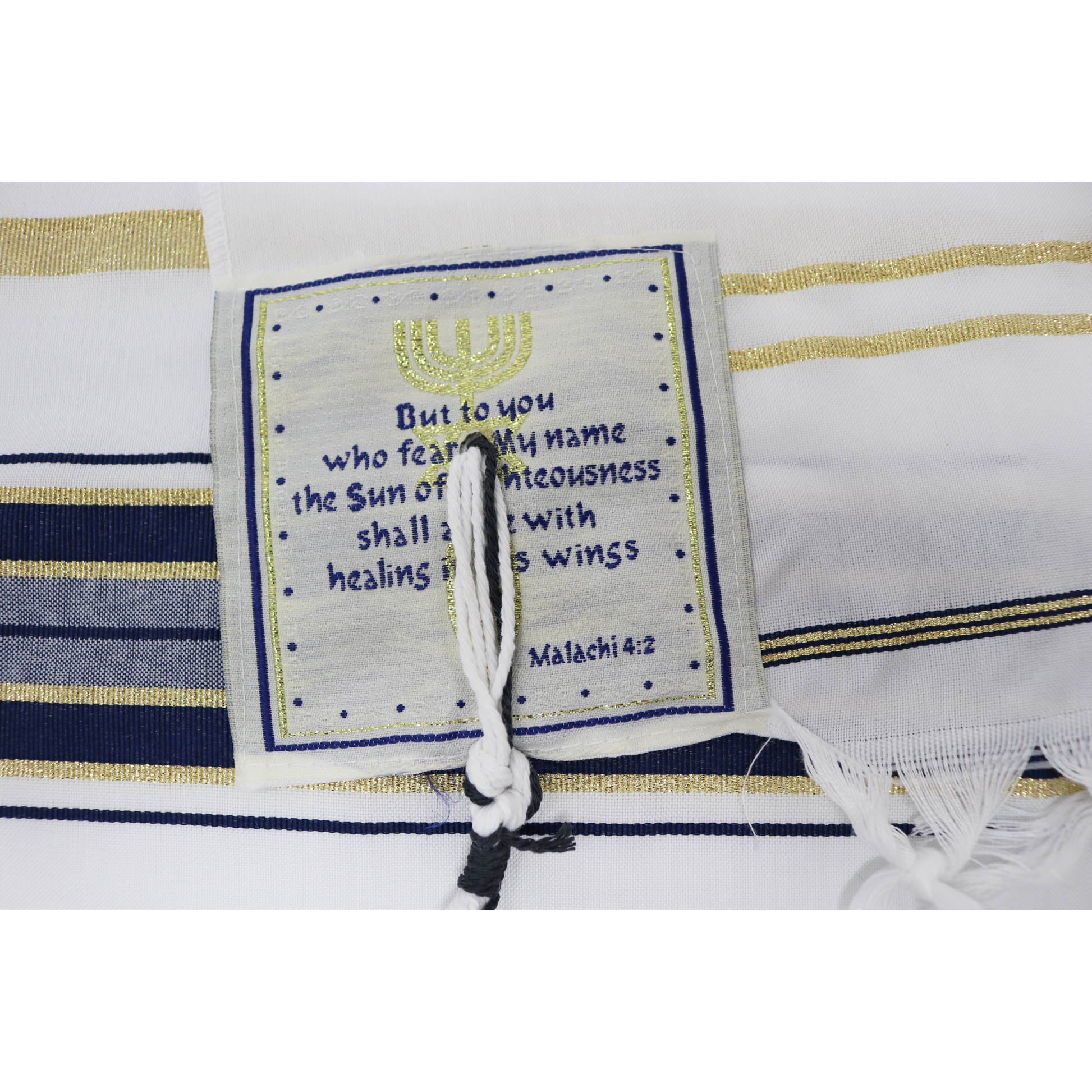 Each of the four corners carries a different Scripture verse, printed in English, reminding the wearer of God’s promises of healing, redemption, and righteousness: