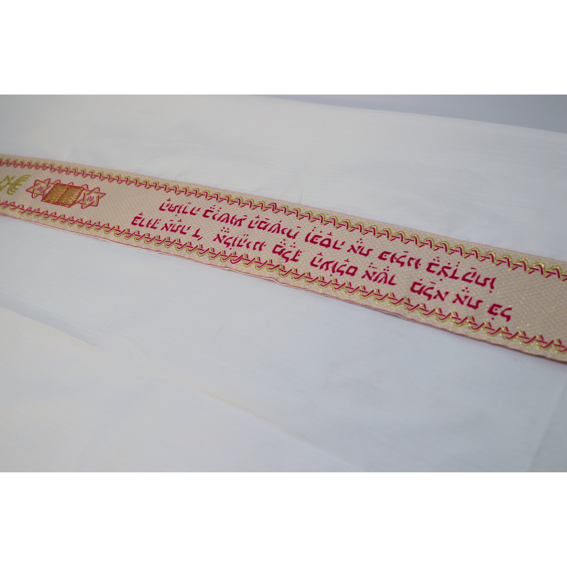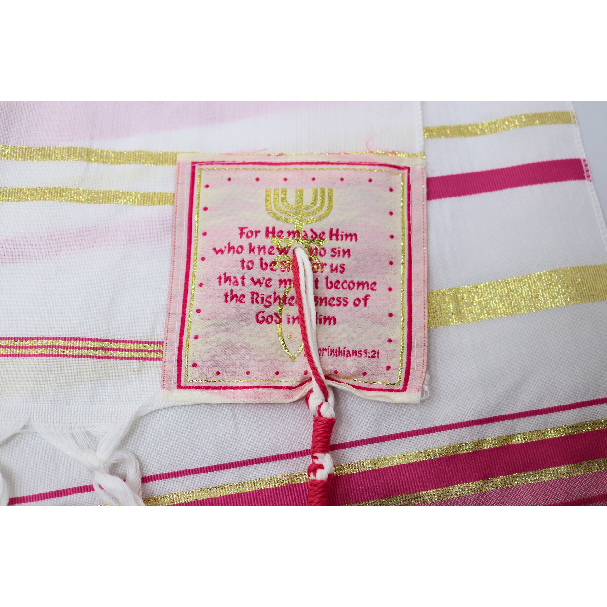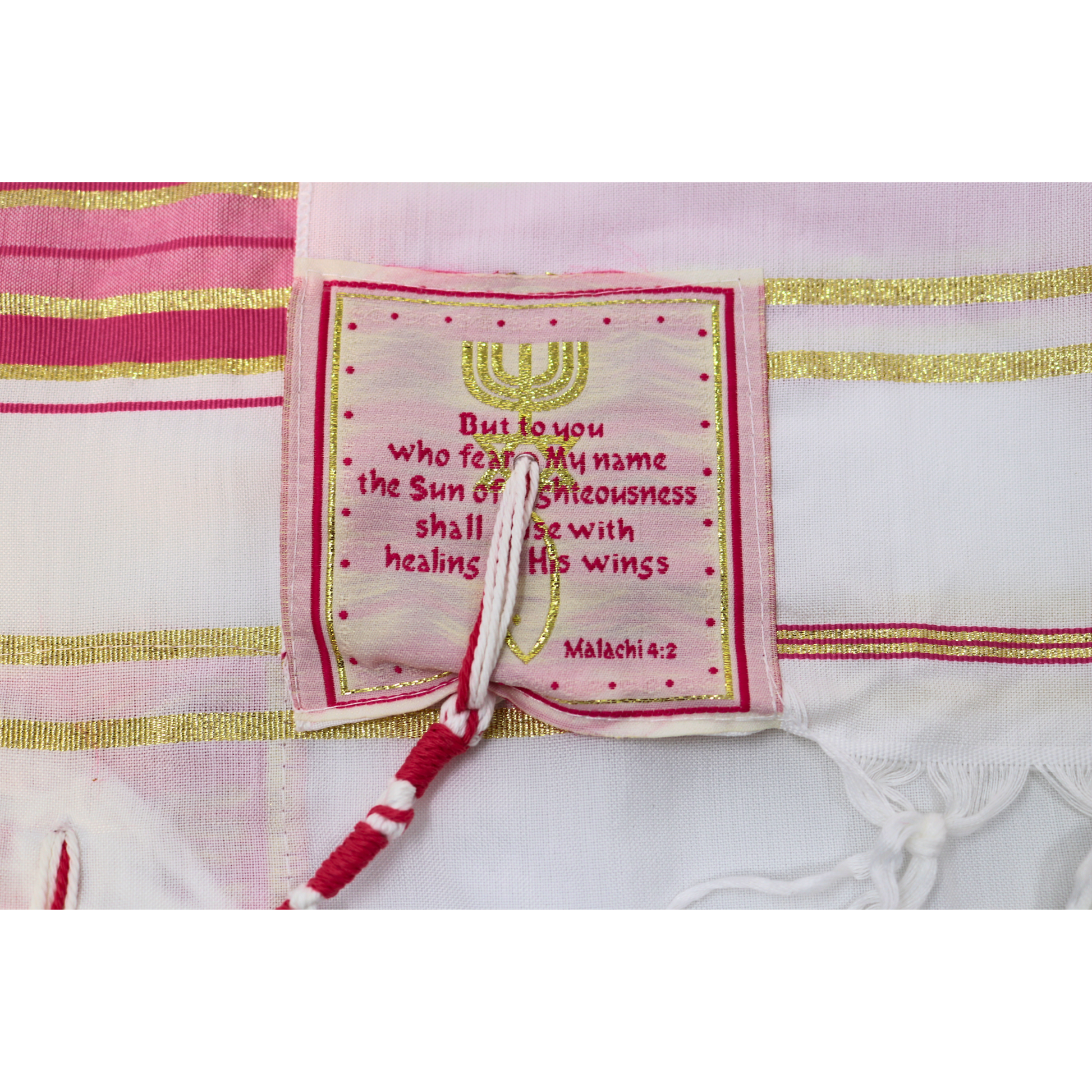 White Prayer Shawl with Pink & Gold Accents – A Symbol of Faith, Healing, and Righteousness