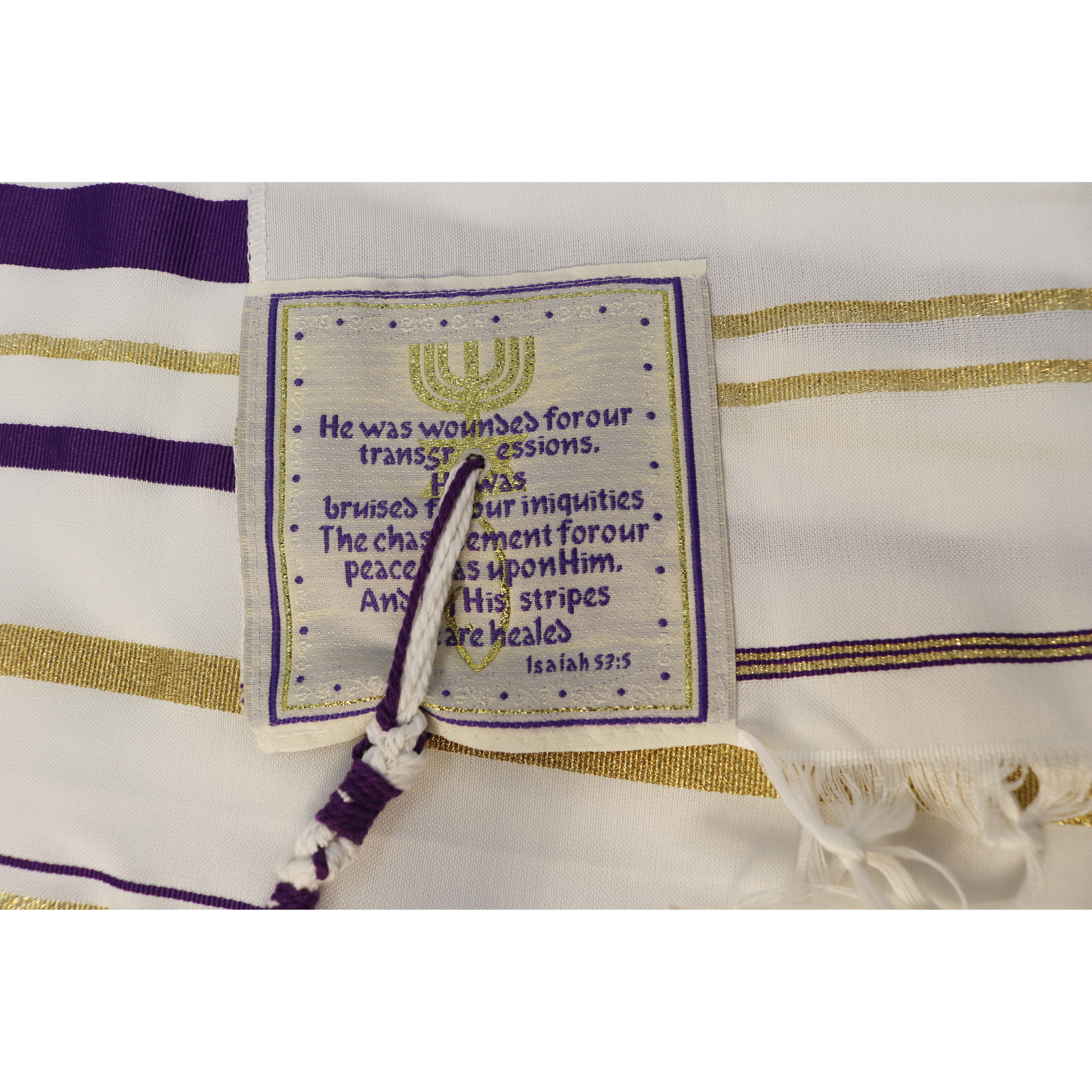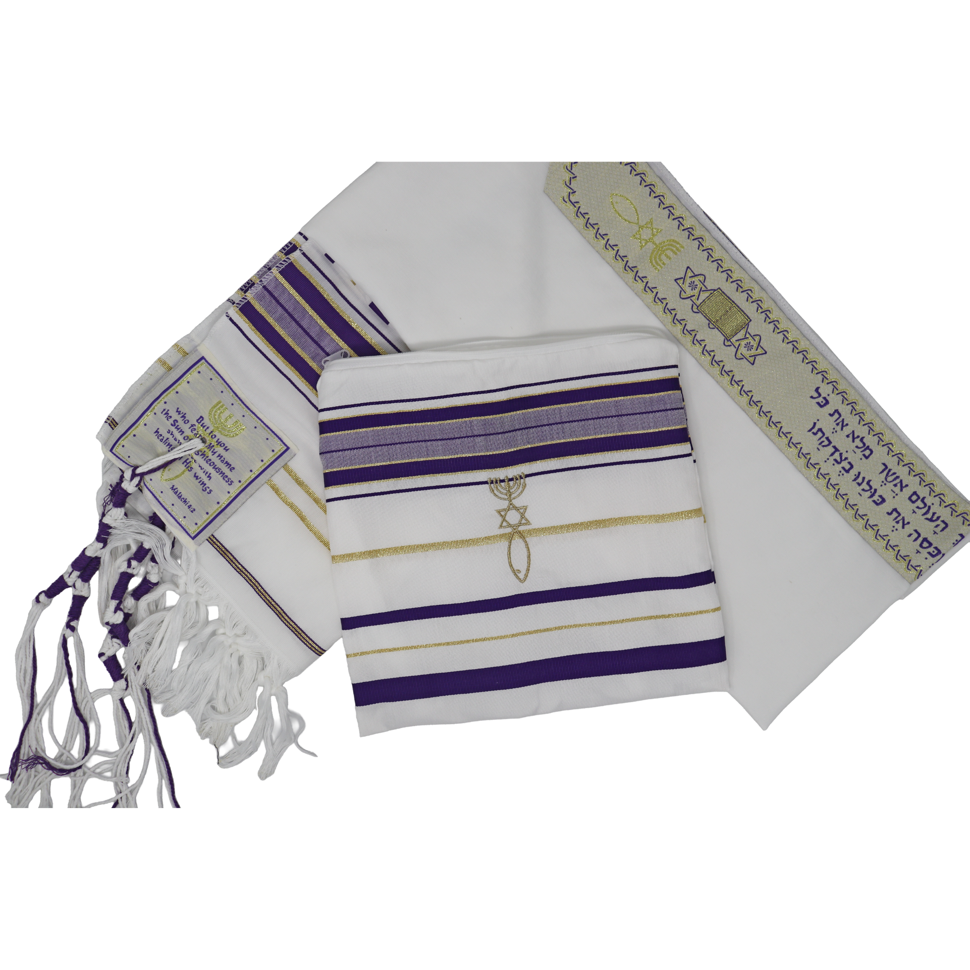 Crafted in soft, high-quality acrylic, this white prayer shawl features elegant purple and metallic gold stripes and includes matching zippered bag with embroidered Grafted-In symbol on it. The collar is adorned with the Grafted-In symbol, a powerful emblem of unity in faith, and inscribed in Hebrew with the blessing: