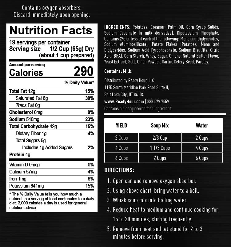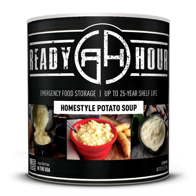 When you have Homestyle Potato Soup on your pantry shelf and a big can in your emergency food kit, you will never have to worry about a crisis leaving you out in the cold! You get the added benefit of the #10 Can by Ready Hour which is 5 times bigger than a normal soup can, which makes this the right choice for food storage. Emergencies are not a time to be unprepared without food.