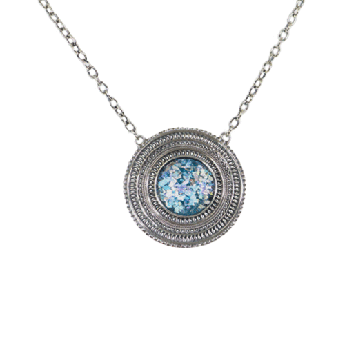 This gorgeous necklace features a sparkling circle of glittering Roman glass shards in a dazzling array of iridescent hues and framed in an intricate sterling silver design. It is hung in a split hook at the top. Beautiful and elegant, it will make a truly special gift for yourself or someone special.
