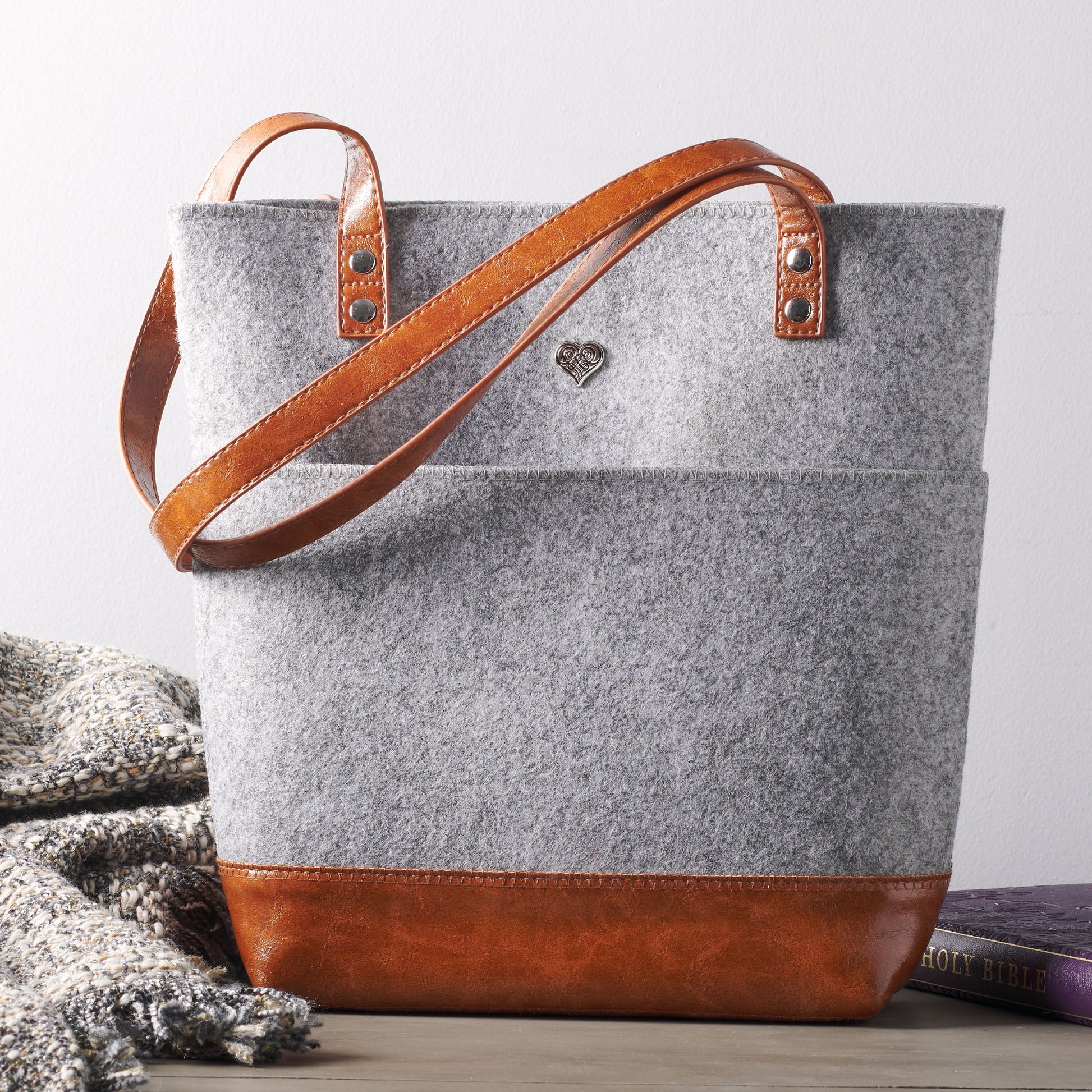 Silver Heart Heather Gray Felt and Toffee Brown Faux Leather Fashion Bible Tote Bag