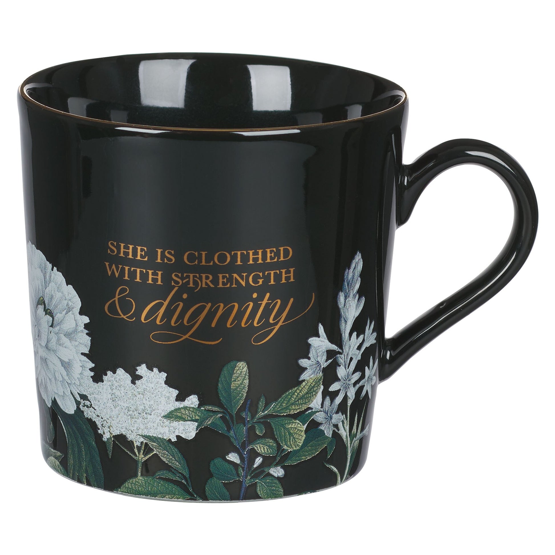 Strength and Dignity Black Floral Ceramic Coffee Mug - Proverbs 31:25