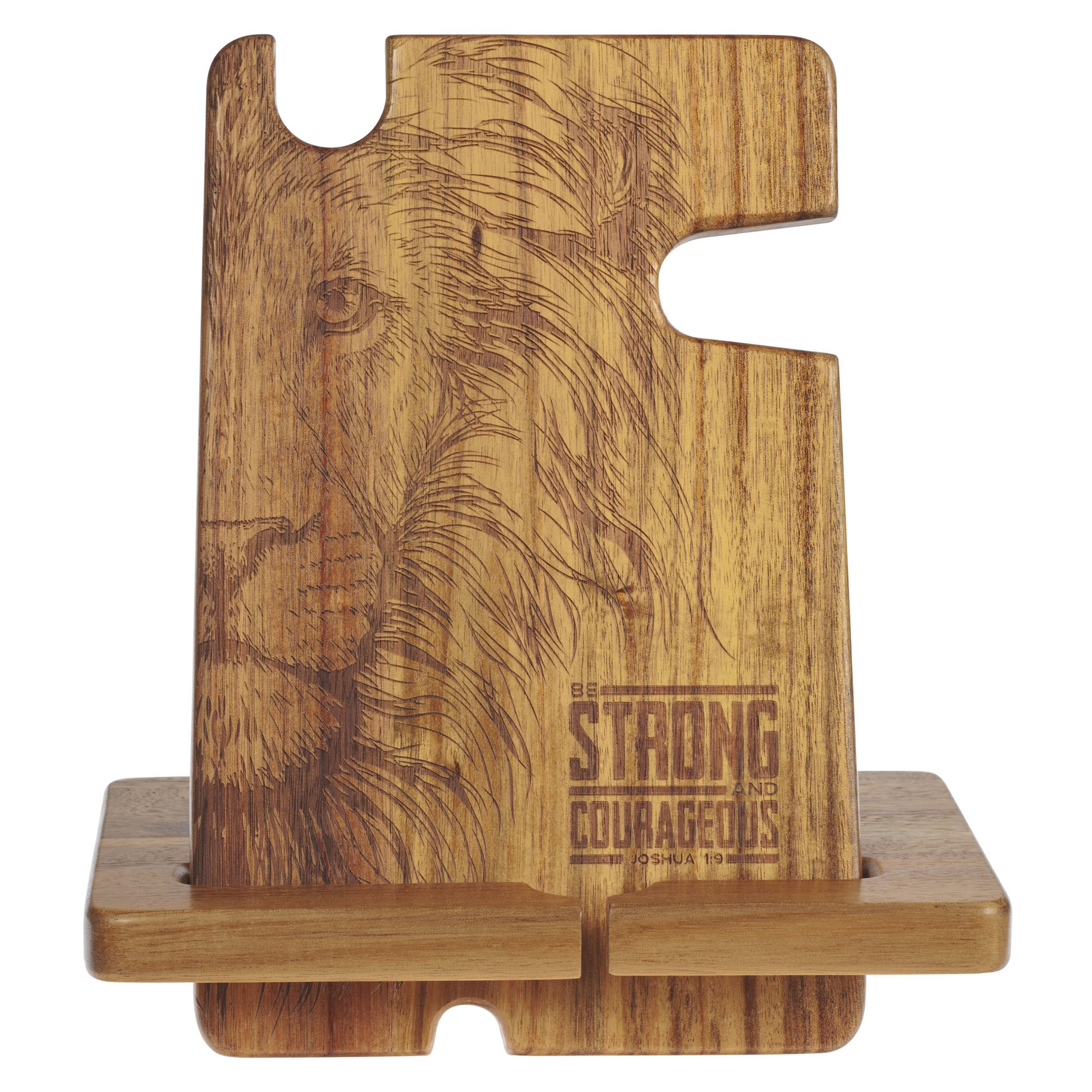 A stunning laser-engraved lion's face decorates the wooden organizer on the right, while the Scripture reference is laser-engraved on the left.