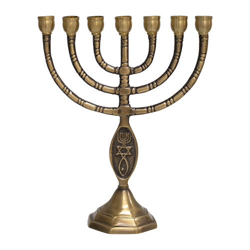 This is a solid brass menorah decorated with the Grafted-In symbol on its stem. The menorah is the oldest symbol dating back to the tabernacle in the wilderness. This beautiful brass menorah is the perfect size for any room. It is a wonderful way to honor the menorahs from the Temple times.