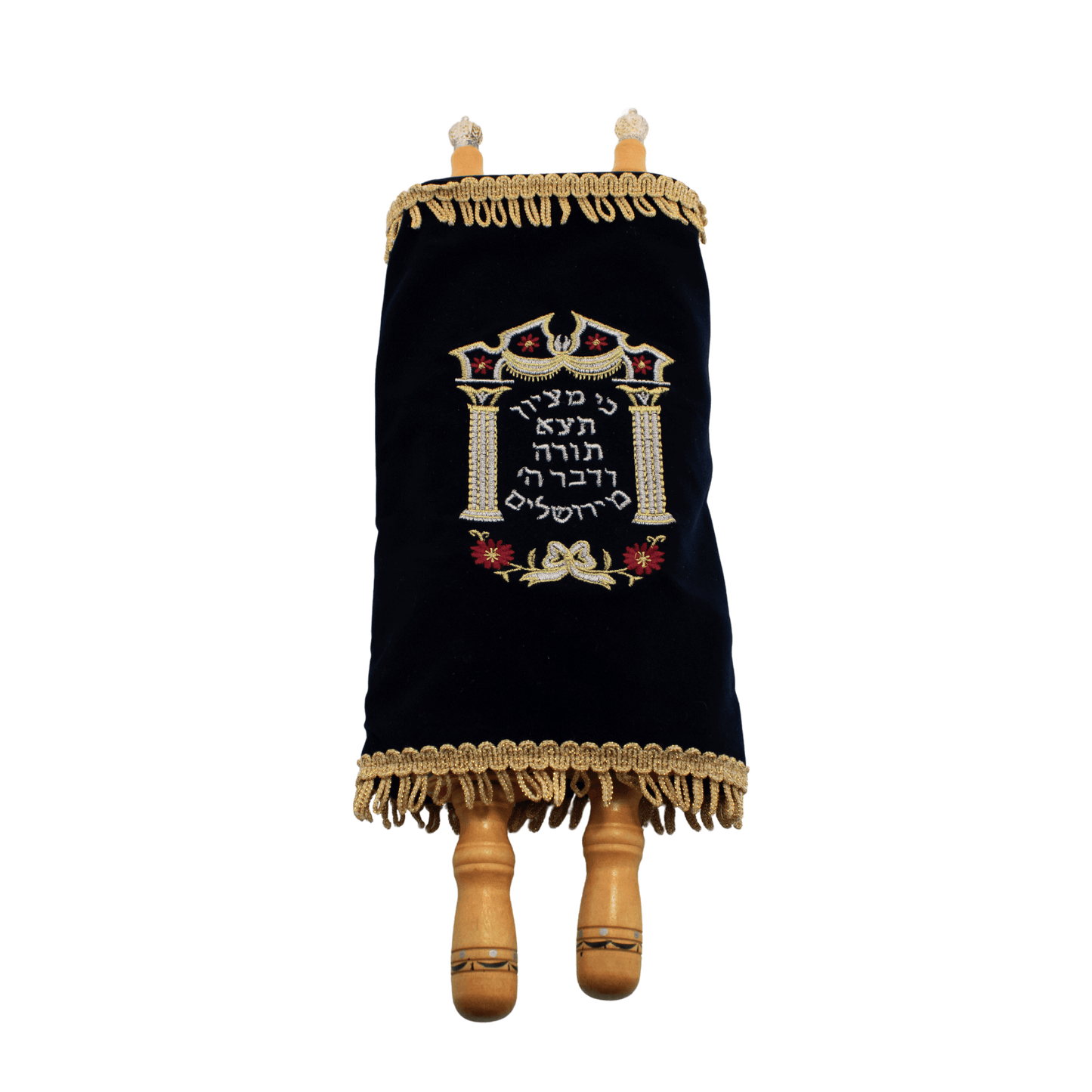 The large Torah Scroll has decorative wooden handles and an embroidered velvet cover. The wooden handles are embellished with a delicately painted design and silver caps on their upper tips. The Navy Blue velvet cover is embroidered with the Hebrew words: