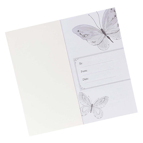 Pretty purple embossed butterflies flutter across the creamy white paperback covers of the little gift book. The title is placed within a large purple medallion on the front page and is presented in large white letters.