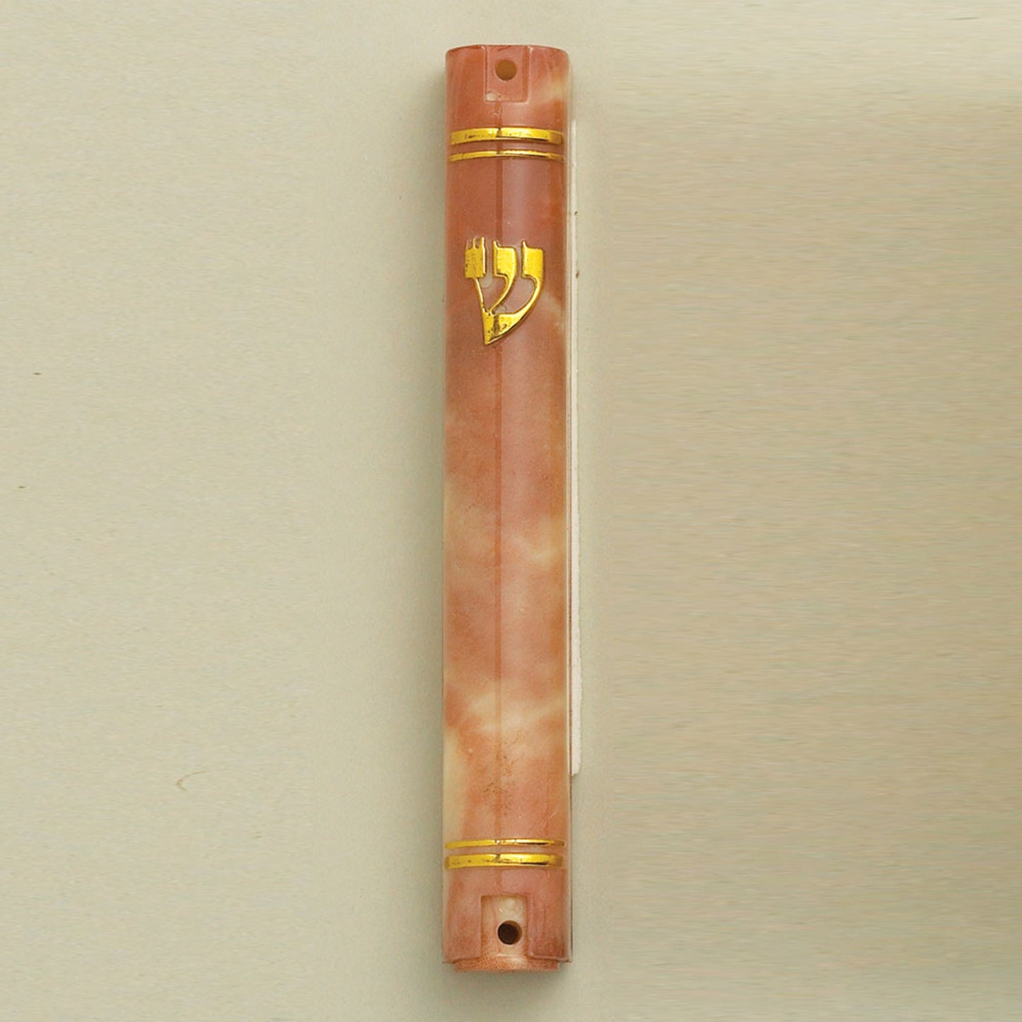 The Marbleized Pink Plastic Mezuzah stands at an elegant 4 inches high, specifically designed to securely hold a 3.75-inch parchment. Its waterproof construction guarantees durability and protection against moisture, making it suitable for diverse environments.