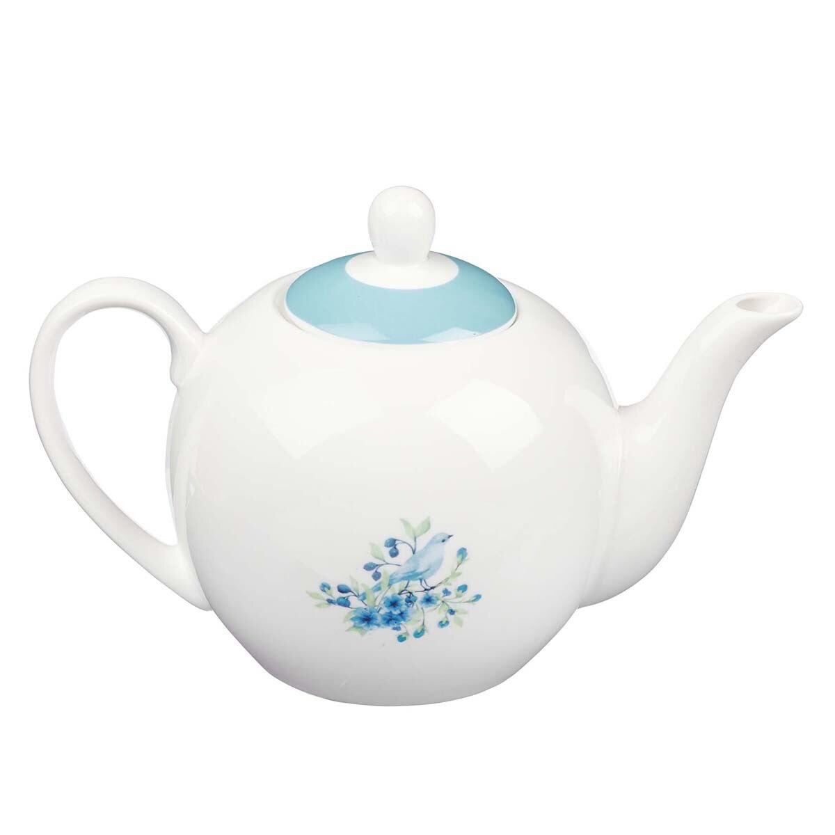 On one side of this white ceramic teapot, a bluebird perches serenely on a wreath of blue flowers that encircles the paraphrased sentiment taken from Proverbs (TPT),