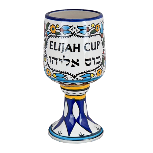 One of the most beautiful customs of the Passover Seder is to designate a cup of wine for Elijah the Prophet who is believed to visit every Jewish home on this night. Add some colorful style to your holiday table with this beautiful Elijah Cup featuring the Hebrew and English words for "Elijah Cup" surrounded by a classic Armenian floral design. Although it is filled with wine, the wine is not consumed.