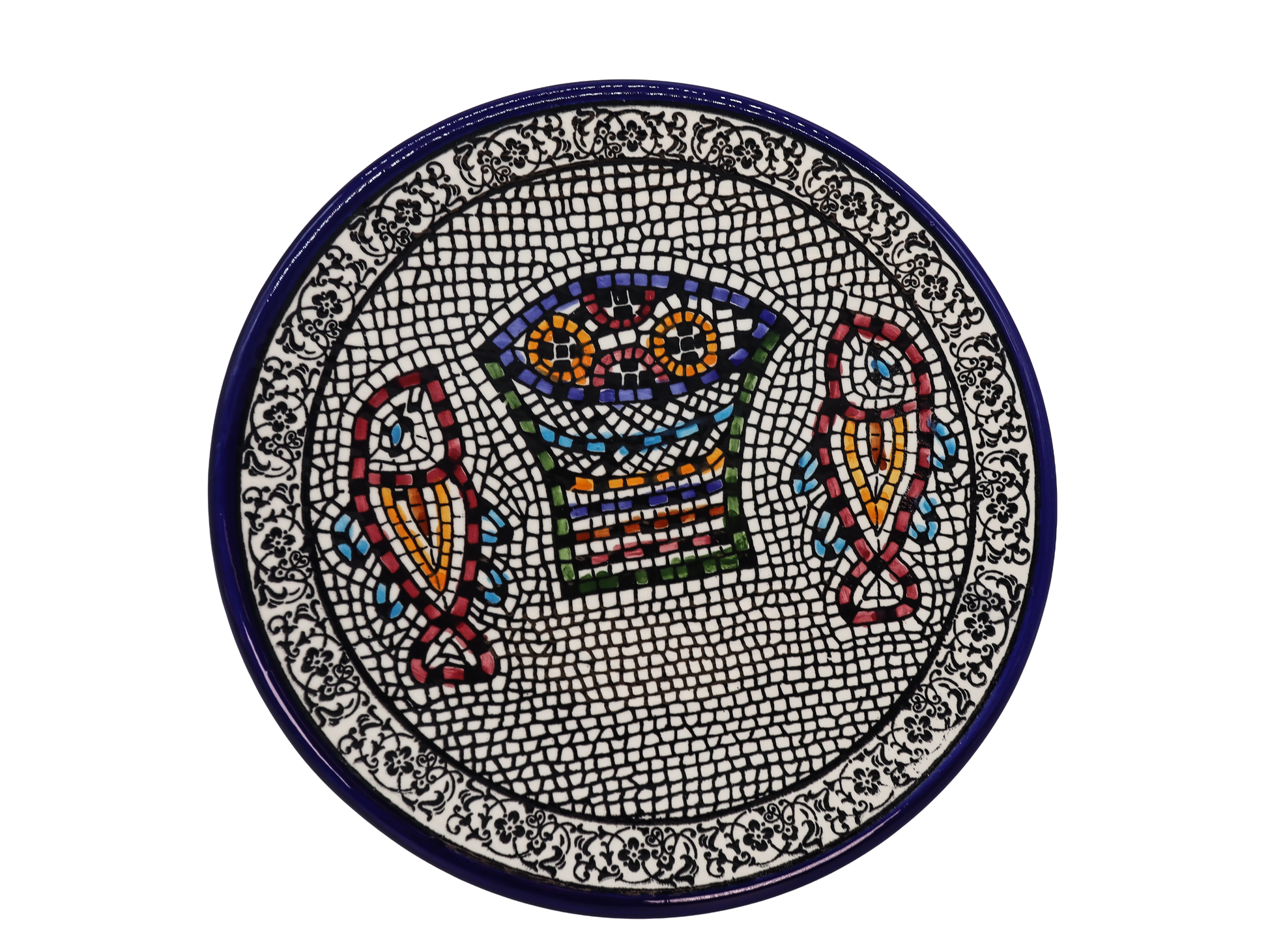 This gorgeous Armenian ceramic decorative plate is a colorful representation of the scripture in Matthew 14:13-21 where Jesus feeds the multitudes with 5 loaves of bread and 2 fish.