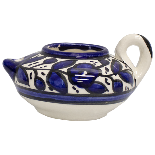 This beautiful blue-colored floral print Armenian ceramic oil lamp is fully functional. Simply add olive oil and the included wick to the lamp and it is ready to use.