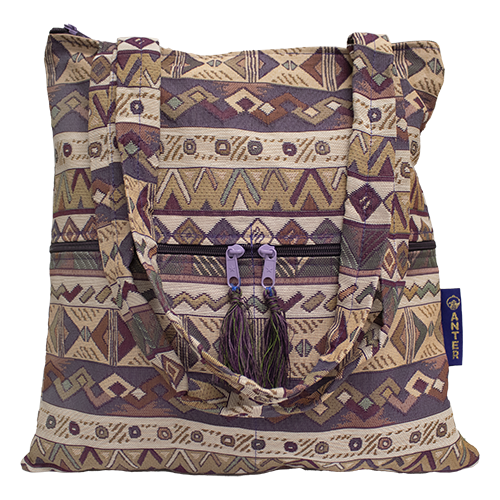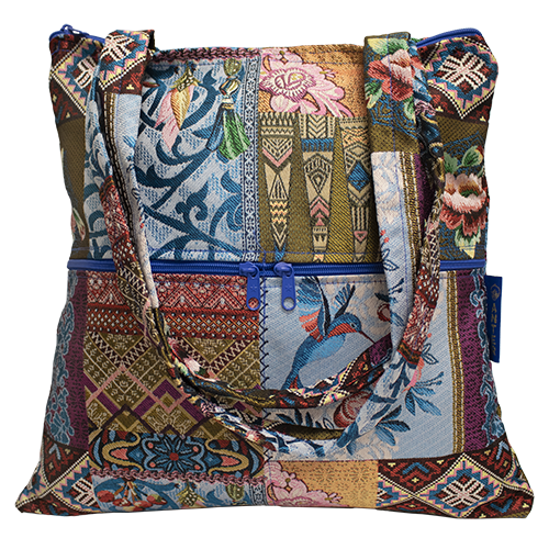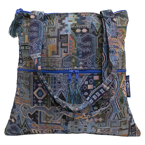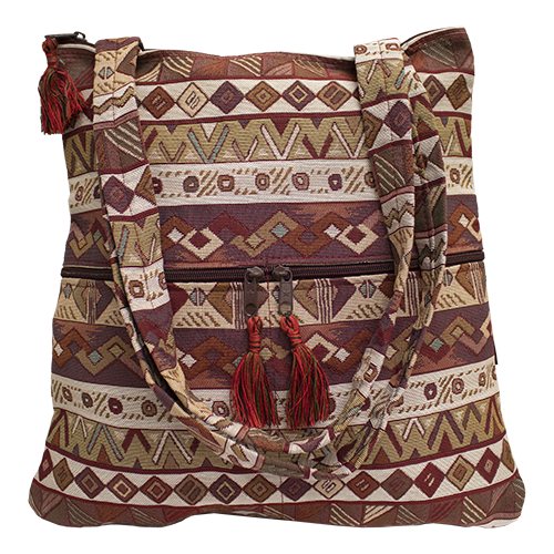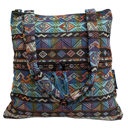 This exquisite purse is in a trapezoid shape to allow more room at the bottom. The purse is fully lined and has two zippered pockets on the front of the purse to store your cell phone, glasses and more. There are two 11" shoulder straps that allow for it to fit easily under your arm and is available in various patterns. This is a woven bag by Druze artisans in Israel.