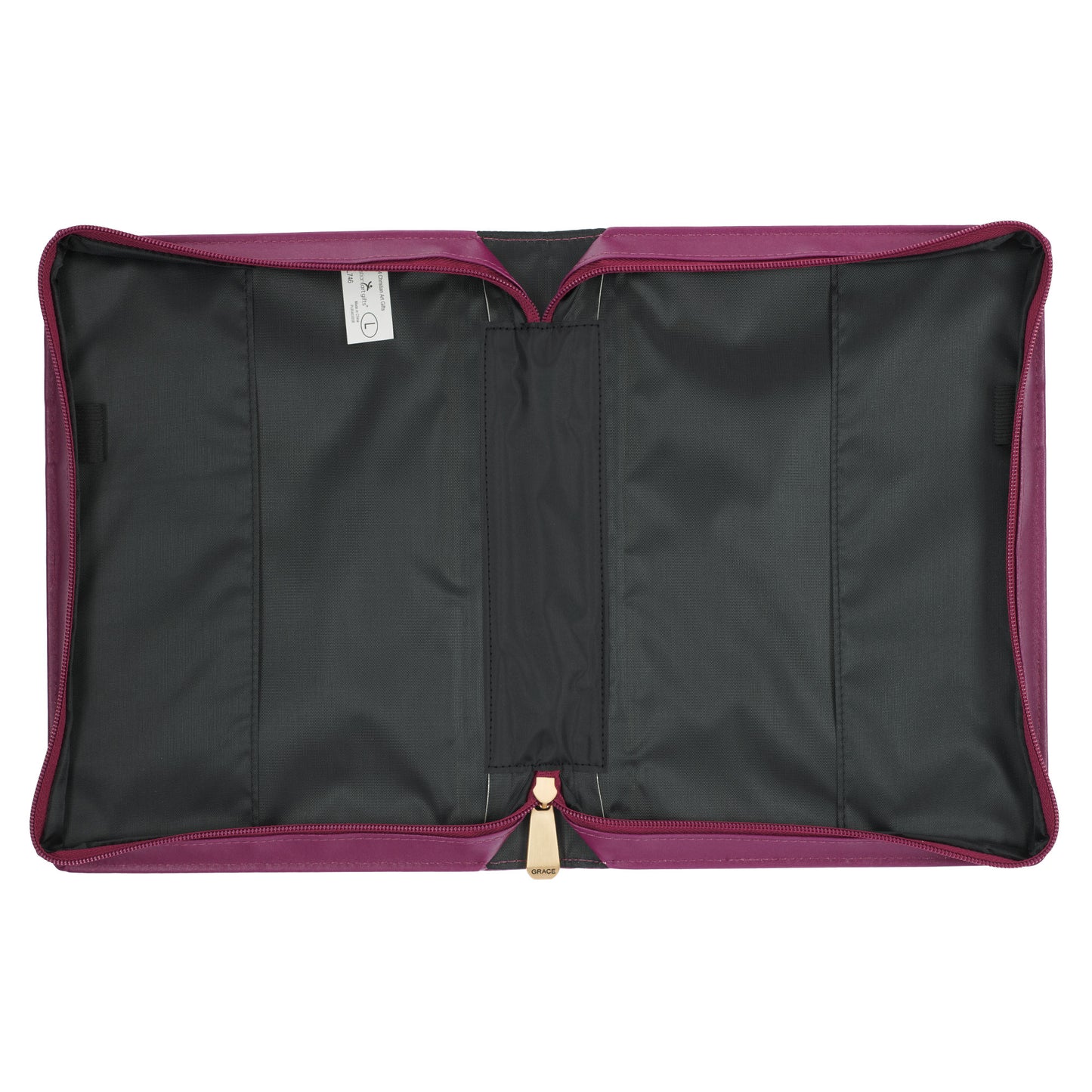 Tuck a church bulletin or handkerchief into the slip pocket for quick and easy storage. Pink faux leather connects the antique gold handle hardware of the pink faux leather fold-away handle to the spine. The same antique gold metal is featured on the zipper pull that is attached to a plum-colored zipper. The word grace is elegantly engraved onto the zipper pull.