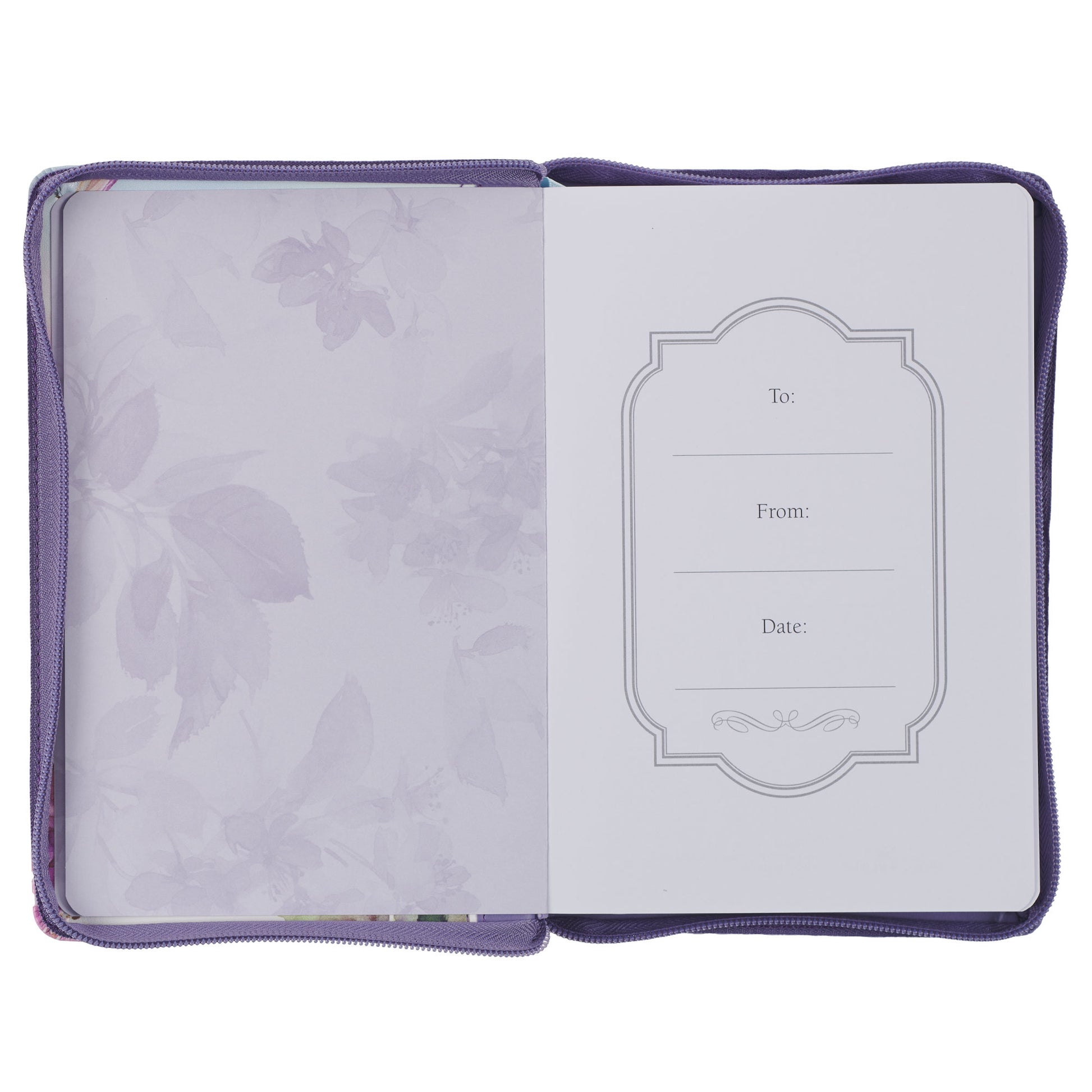 The pages of this flexcover journal, along with any loose notes, are securely protected by a smooth-closing purple zipper closure with a gold metal zipper pull. Its 336 pages are the perfect weight to minimize the risk of bleed-through from writing instruments. Quickly locate your last entry with the attached satin ribbon marker, and draw inspiration from the Bible verse printed at the bottom of each page. For a thoughtful touch, this journal also includes a presentation page, making it an ideal choice for gift-giving.