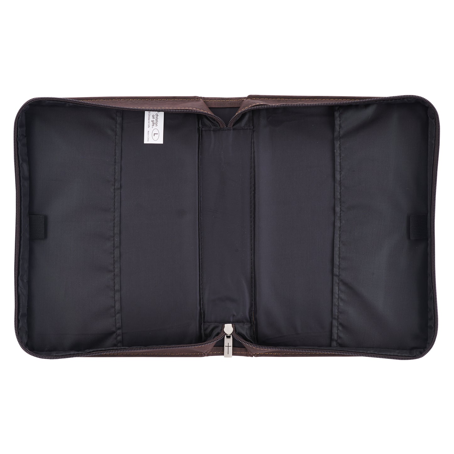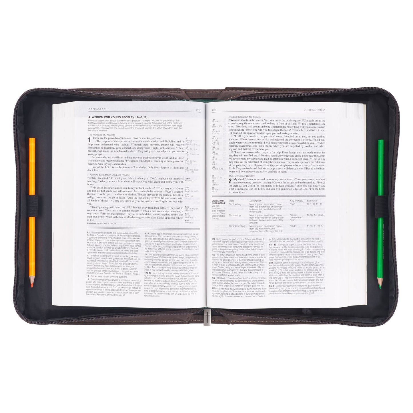 The faux leather Bible cover features a zipper with a cross-engraved metal zipper-pull, a convenient faux leather lay-flat spine handle, and 2 pen loops inside.