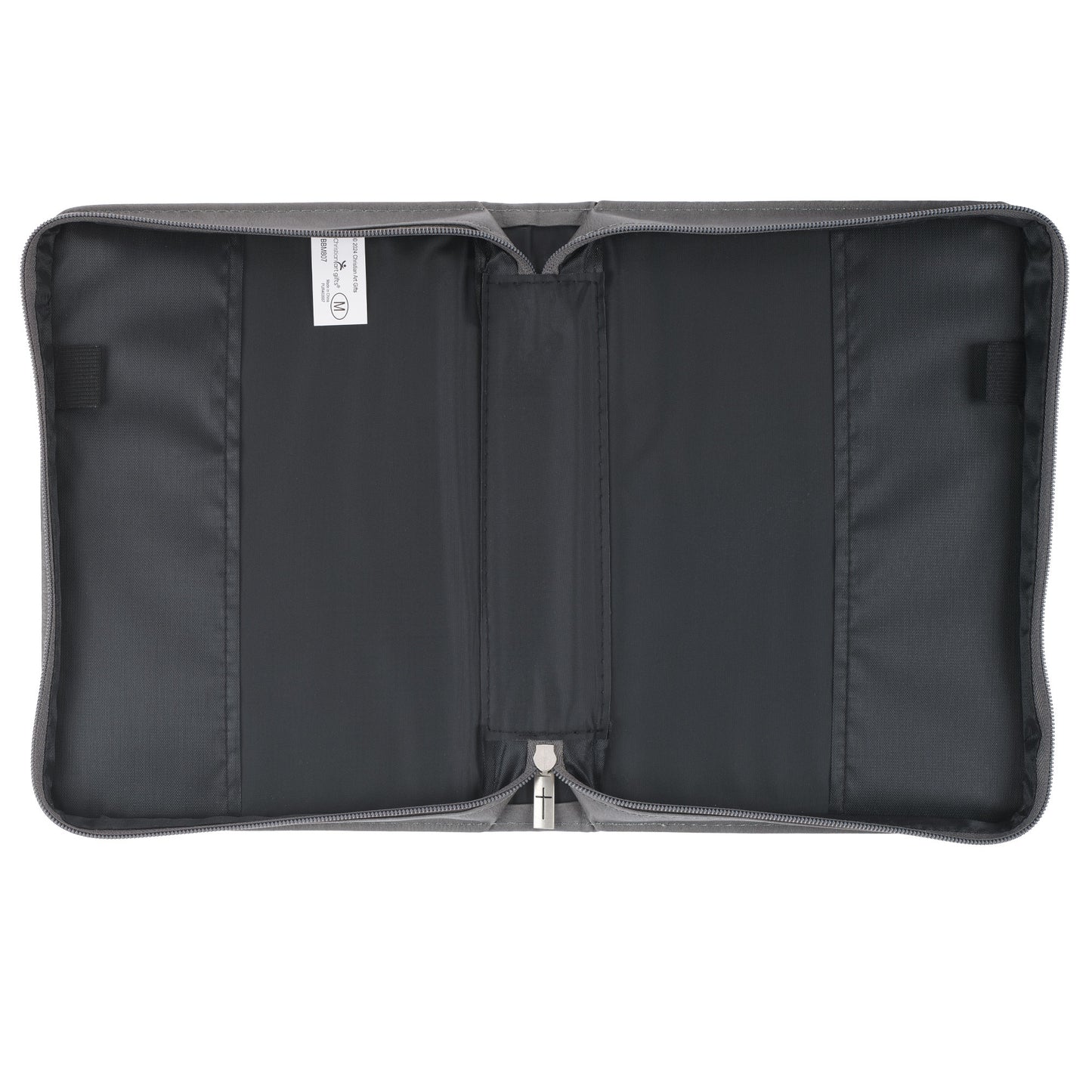 A silver metal zipper pull engraved with a cross is attached to the black zipper that securely closes the covers. Silver metal handle hardware secures the lay-flat faux leather handle and coordinates with the silver foiled details of the cover design. Topstitching along the cover's edges and seams adds strength and durability to a handsome design. A slip pocket on the back panel is handy for storing notes or a slim notebook and is heat-debossed with the Scripture reference.