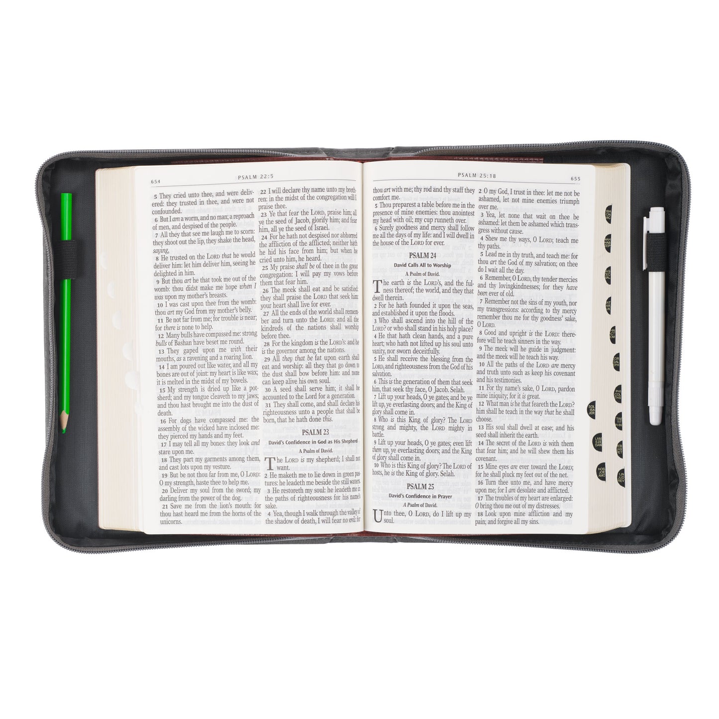 Inside the Bible case, two slip pockets securely hold the cover of your Bible, and two elastic pen loops are included to hold writing instruments.