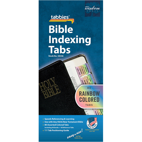 Bible Tabs are designed for the active disciple and study enthusiast. Bright tabs in rainbow colors Tab any size bible with these pre-cut, self-adhesive tabs. Permanent adhesive; won’t fall off. Tabs are printed on both sides for easy reading and quick reference.