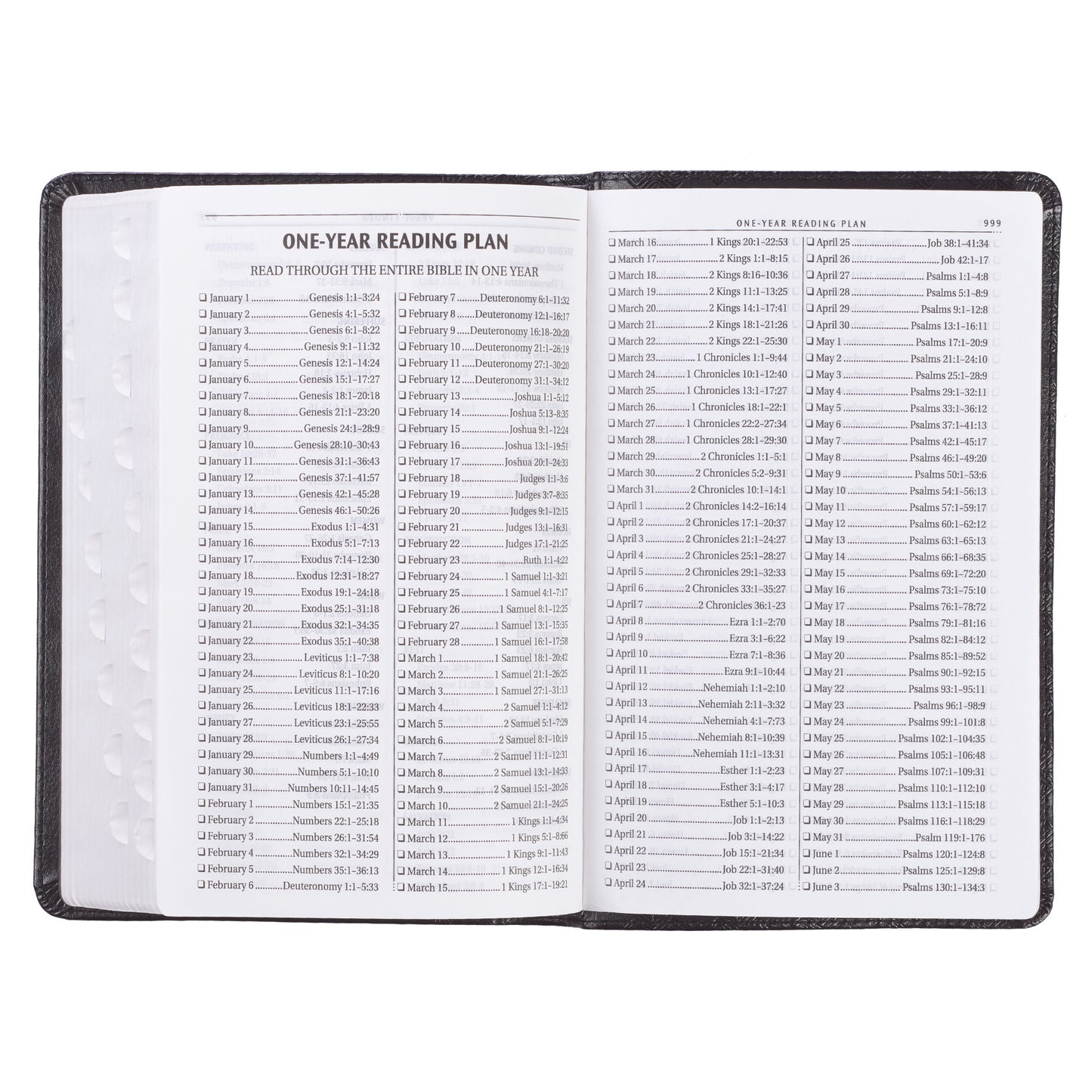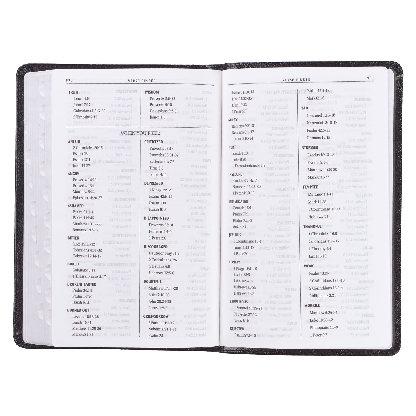 Silver gilt-edged pages, black thumb index tabs, and an attached black satin ribbon page marker adds elegance to an already exquisite design. The standard 9-point type in a double-column format, reader-friendly subheadings, thematic Scripture verse finder, and the words of Christ printed in red will assist you in Bible study. A one-year Bible reading plan is included to keep your reading on track. A presentation page is included to complete with a special encouraging message. The Bible comes packaged in a full-color printed cardboard sleeve.