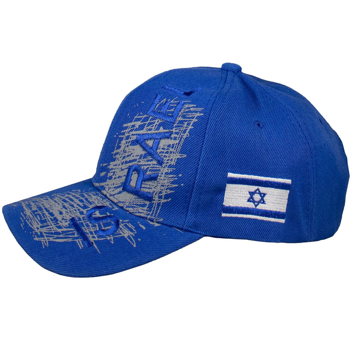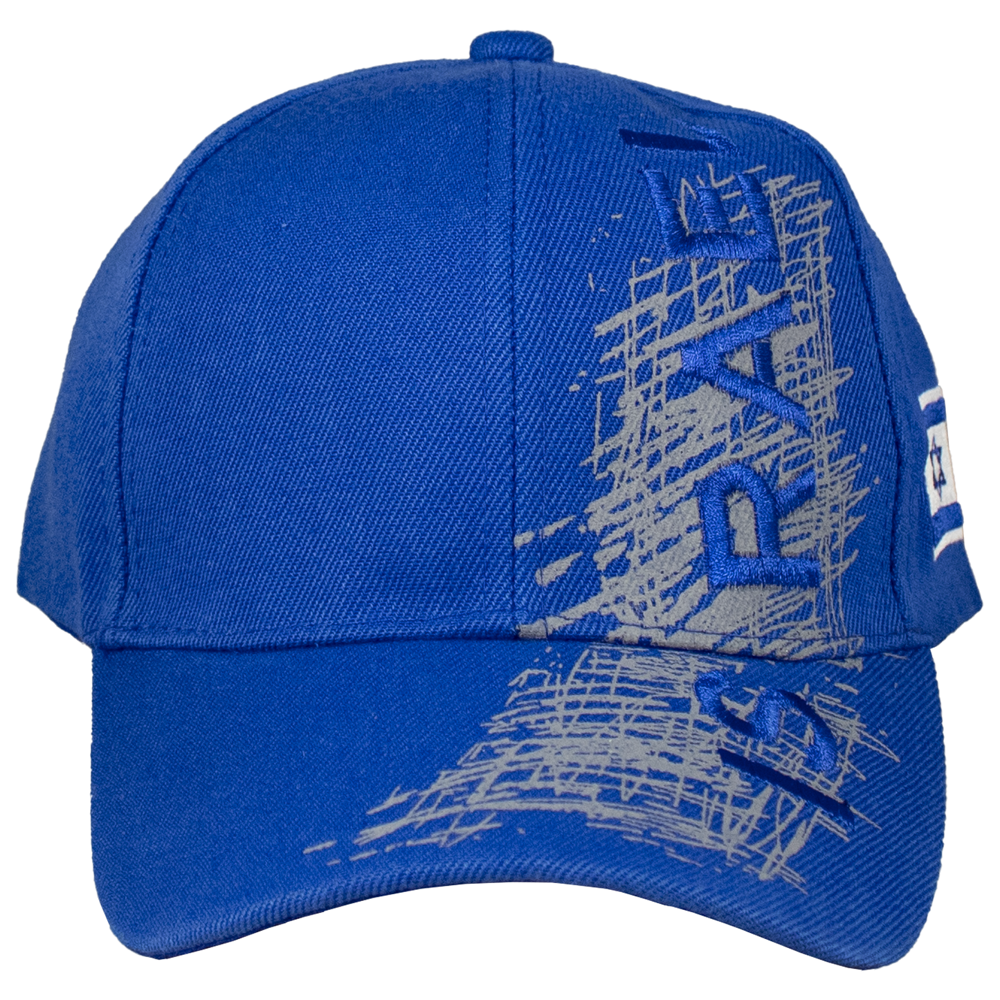 Enjoy wearing this blue 100% cotton baseball cap. The design is modern with a trendy graffiti scribble at the front with an embroidered "ISRAEL" in blue. On the side is an embroidered Israeli flag.