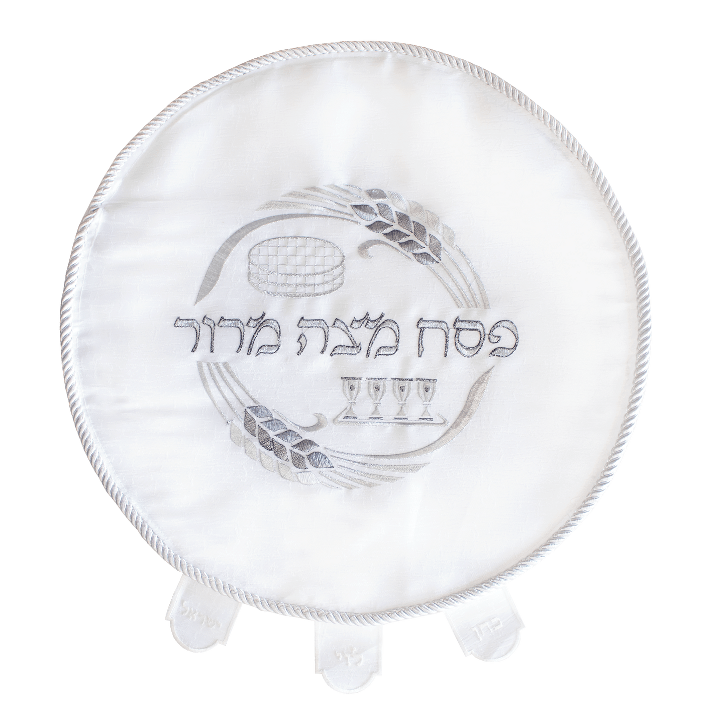 Add the perfect centerpiece to your Seder table with this gorgeous Matzah Cover. It features twisted piping, beautifully embroidered Wheat that frames in 3 Matzahs and 4 glasses on either side of the Hebrew words פסח -Pesach (Passover), מַצָּה Matzah, and מריר Maror (Bitter Herb).